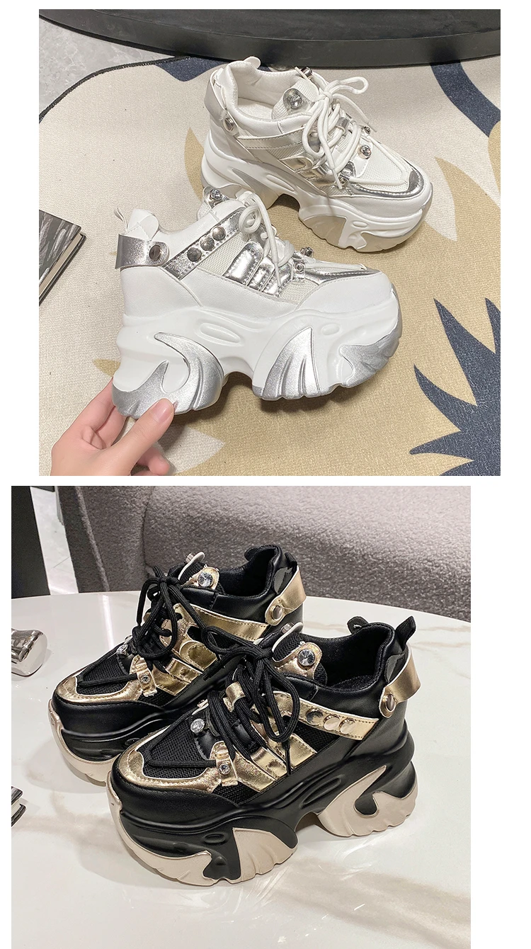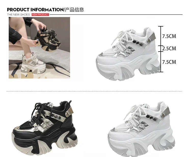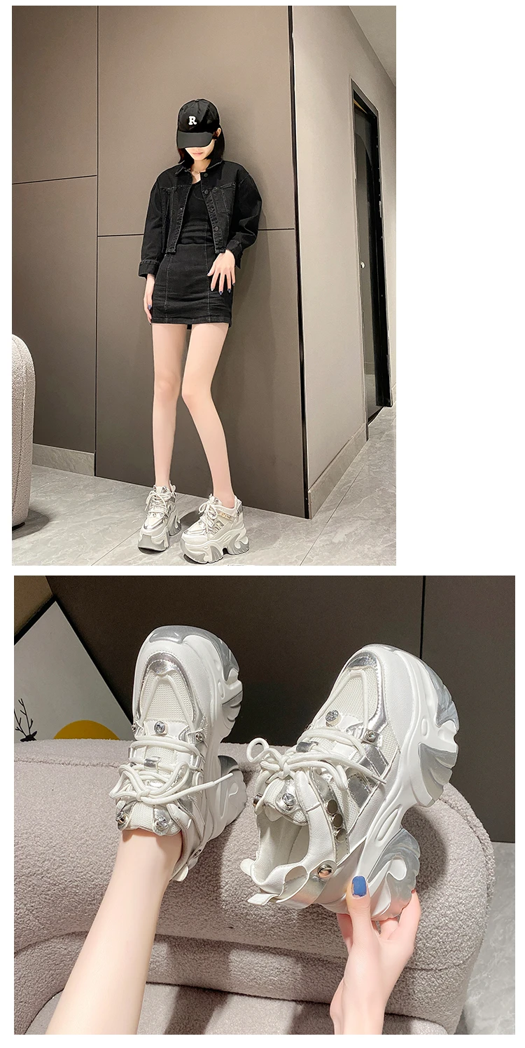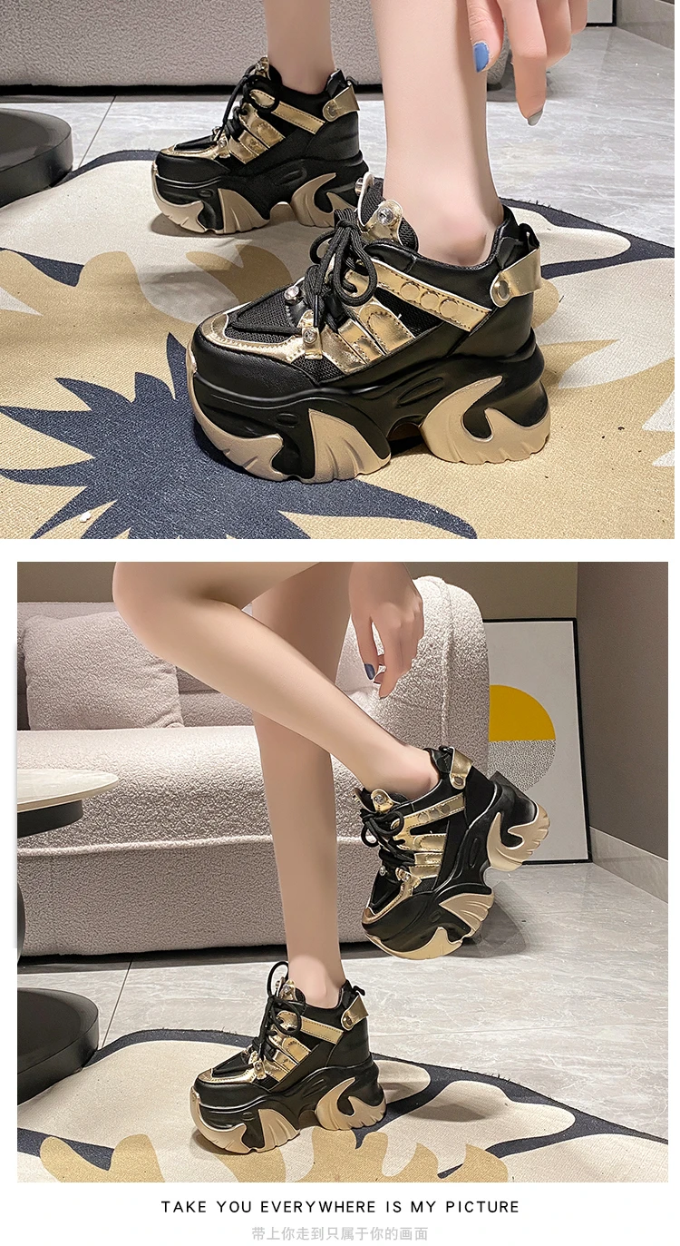 10CM New 2024 Spring Women Chunky Sneakers Heels Lace-up High Platform Sports Shoes Woman Breathable Mesh Shoes Leather Sneakers