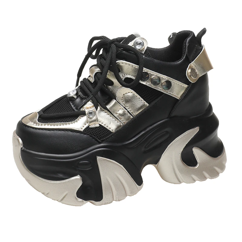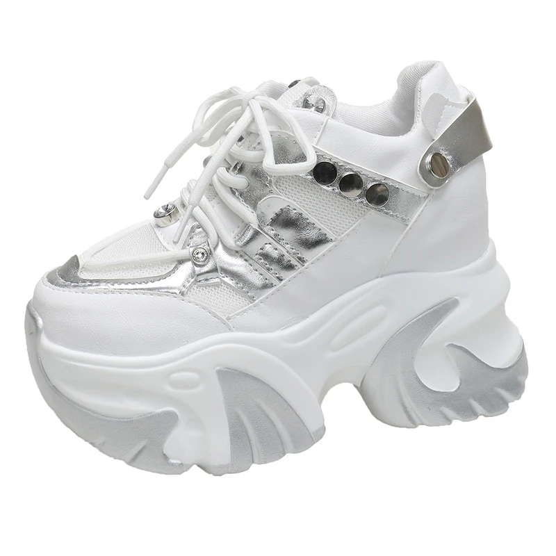 10CM New 2024 Spring Women Chunky Sneakers Heels Lace-up High Platform Sports Shoes Woman Breathable Mesh Shoes Leather Sneakers
