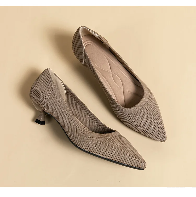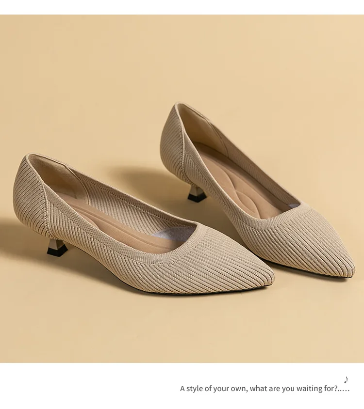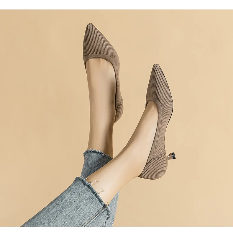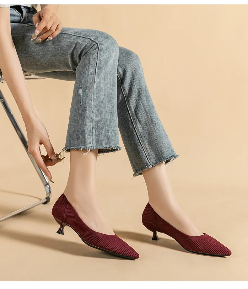 2023 Pointed Toe Solid Color Stretch Knitted Shoes Pumps Slip on Sole Low Heels Breathable Loafers Women Mesh Shallow Sock Shoes