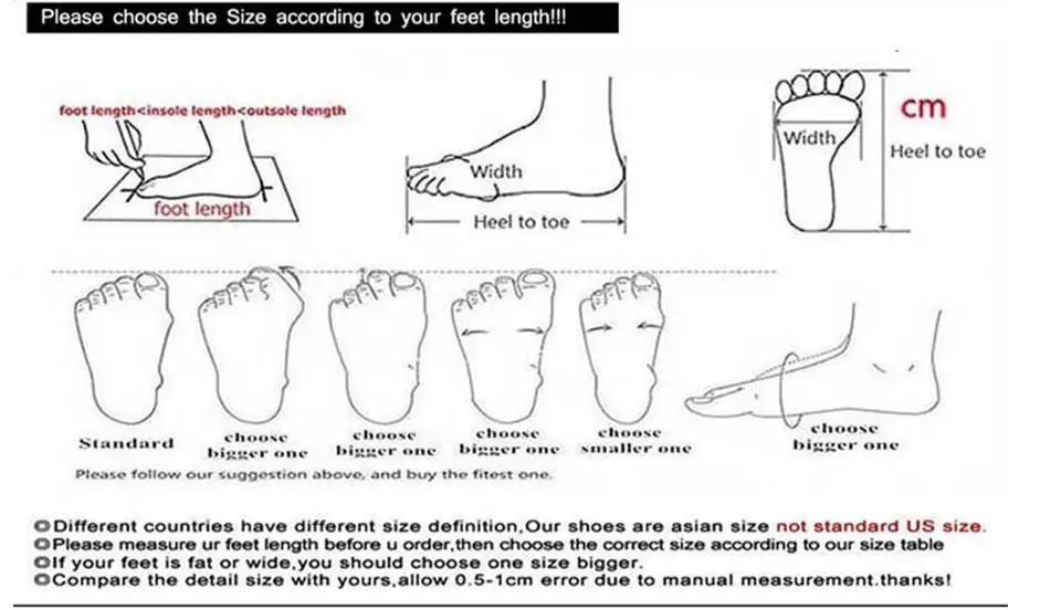 Please note 1. Choose the size according to your foot length (don't/don't choose the size according to the regular size in your country!!! 2. If your feet are a bit wide or the instep is a bit thick, it is better to choose a size
