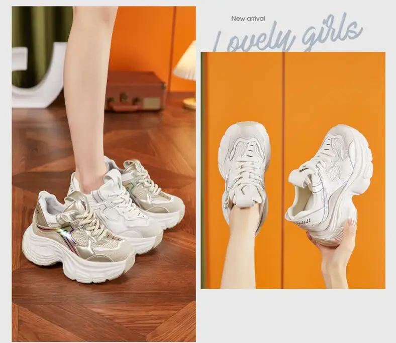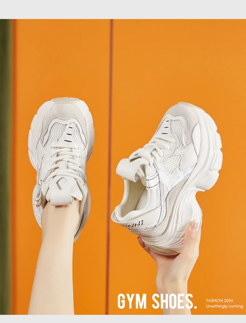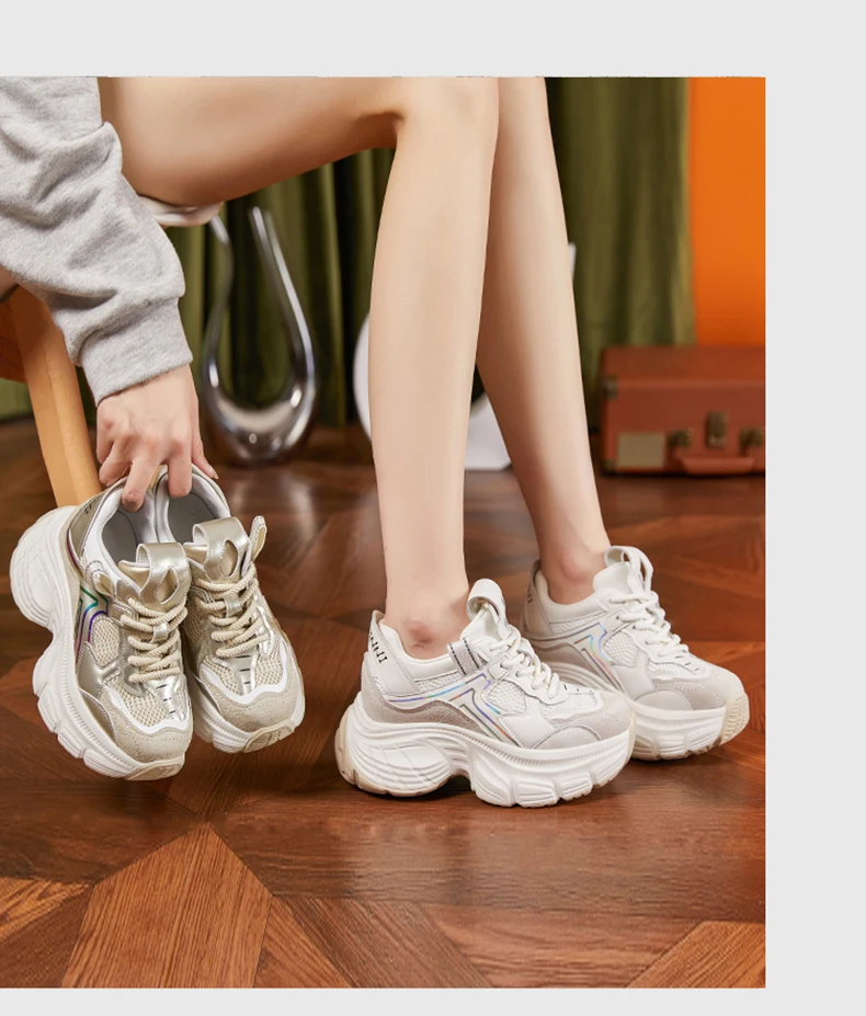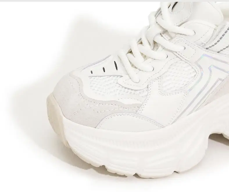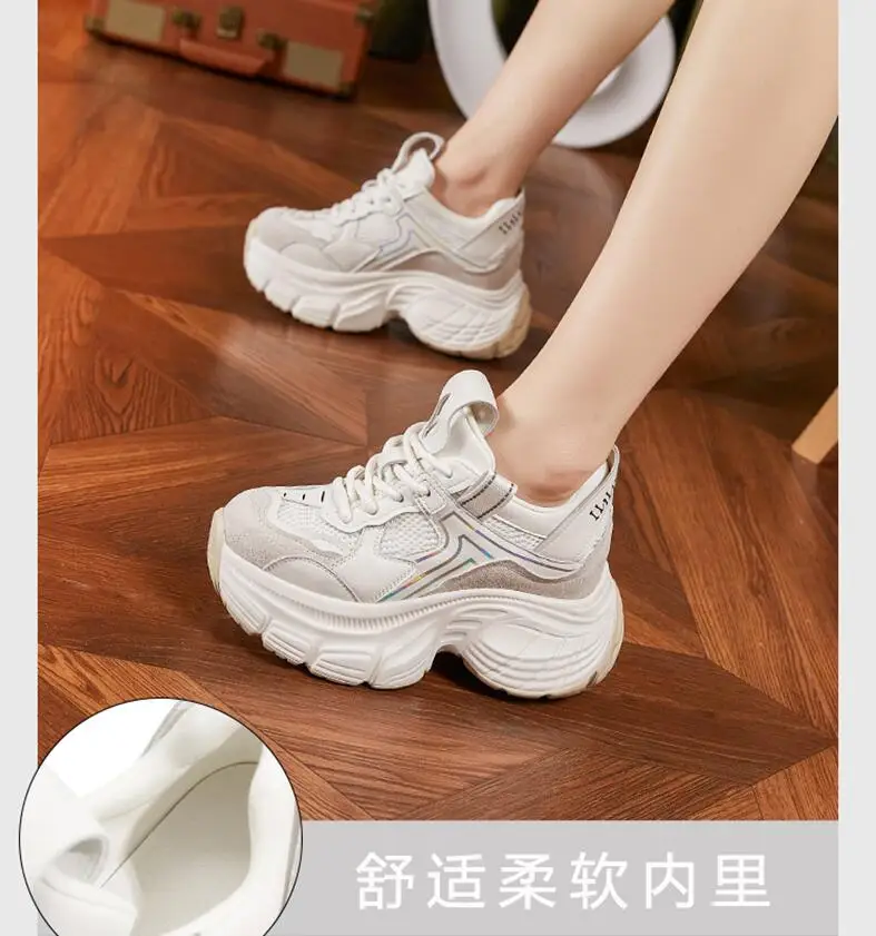 8.5cm Air Mesh Genuine Leather White Sneakers Women Platform Shoes Wedge Pumps Hidden Heel Breathable Female Casual Shoes Spring