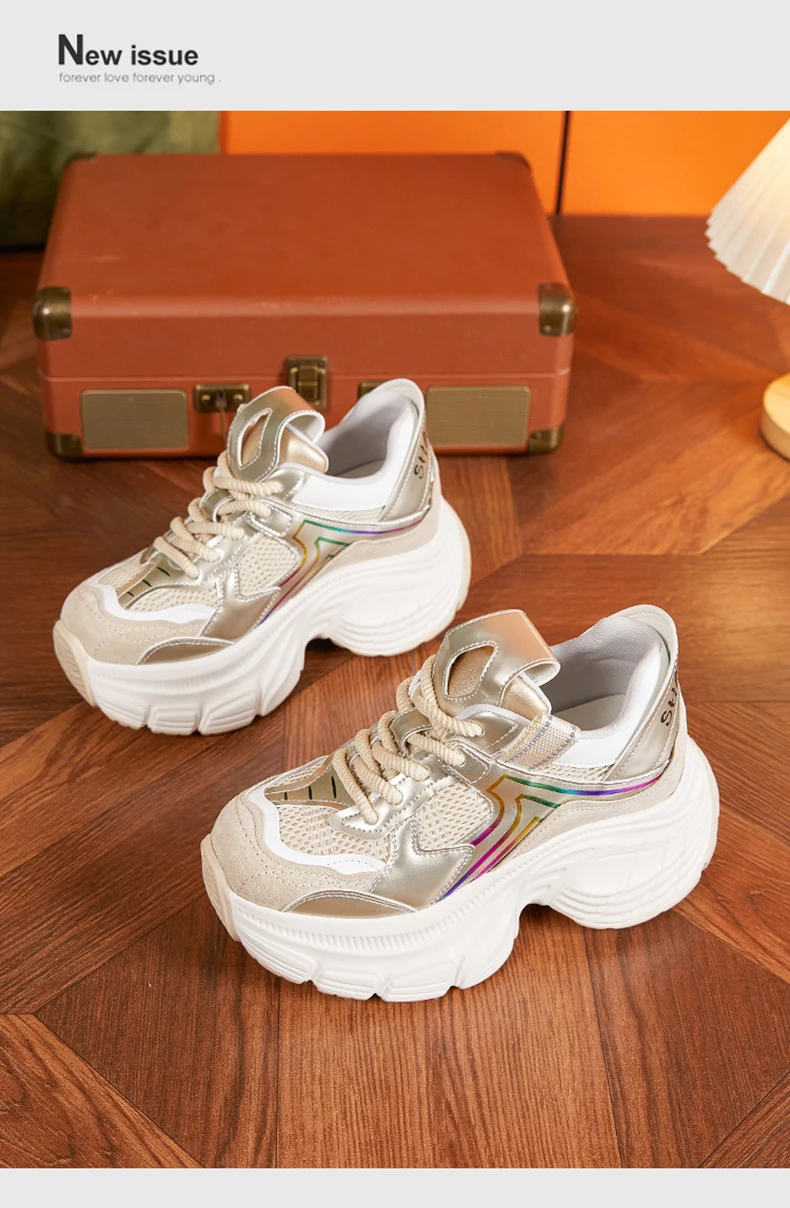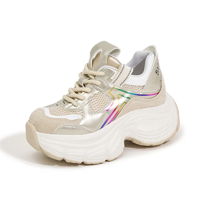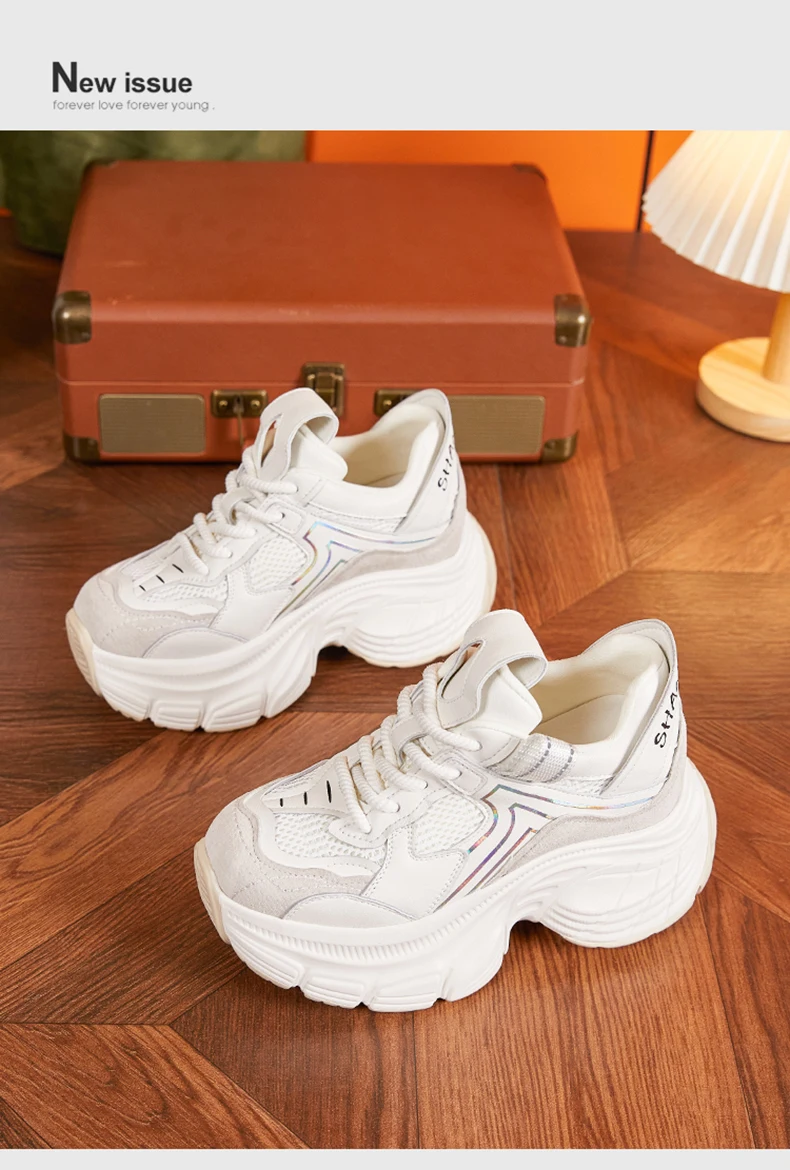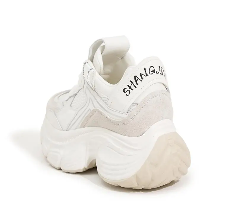 8.5cm Air Mesh Genuine Leather White Sneakers Women Platform Shoes Wedge Pumps Hidden Heel Breathable Female Casual Shoes Spring