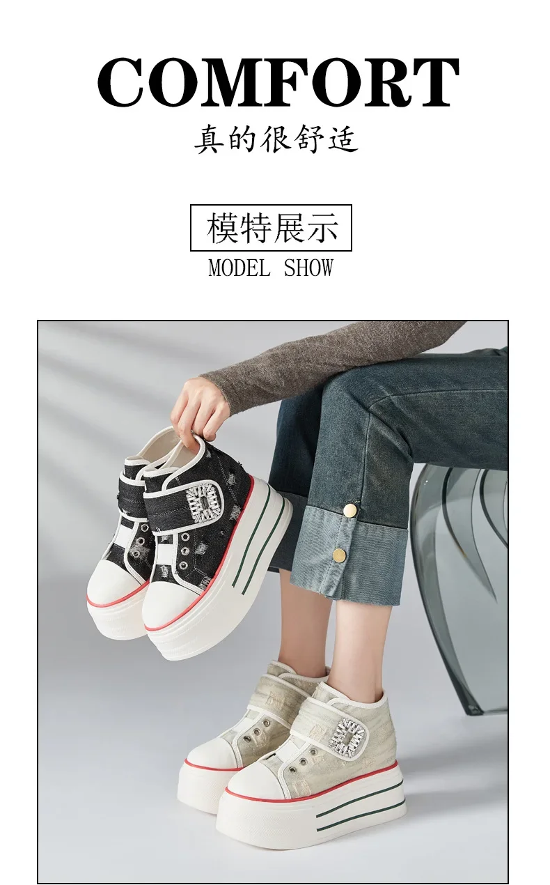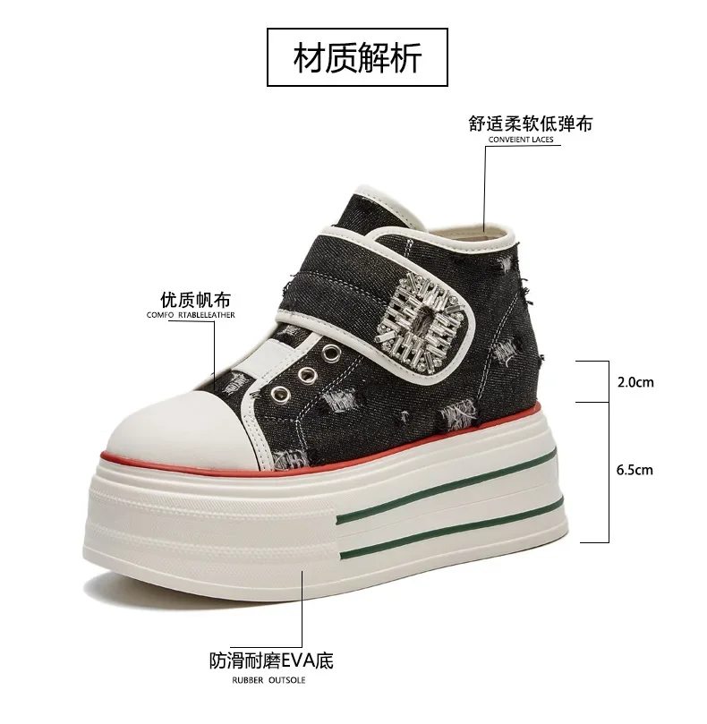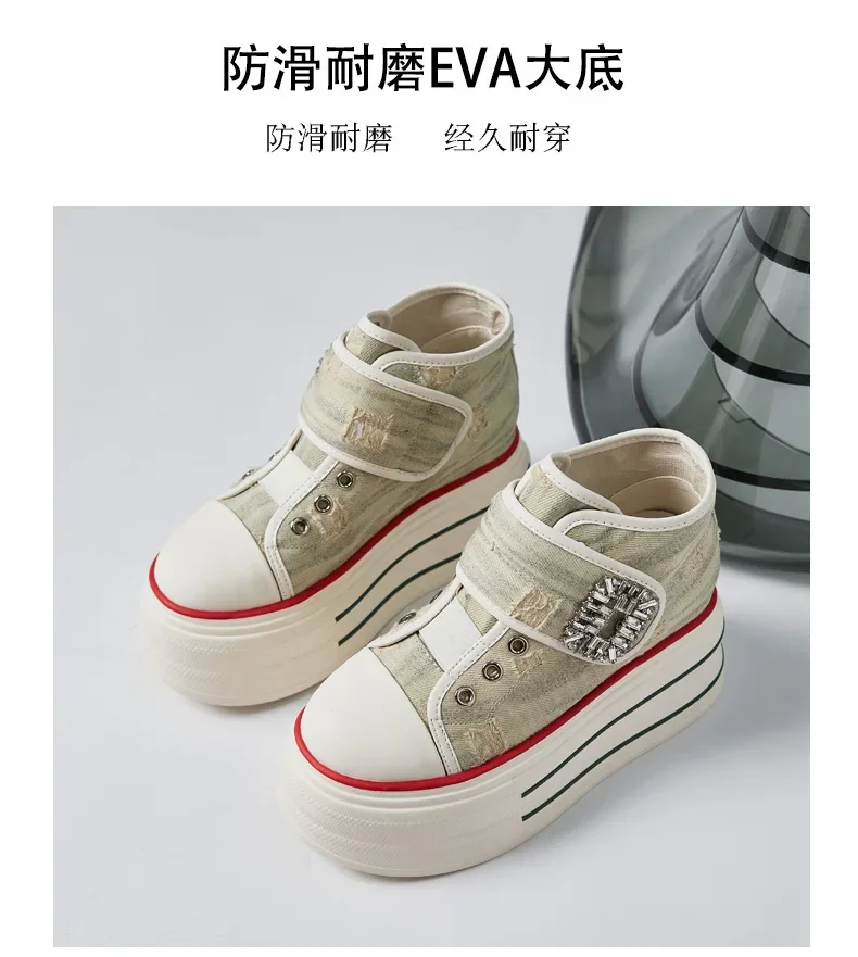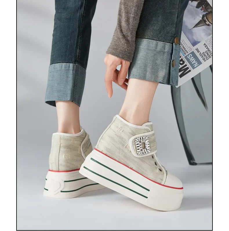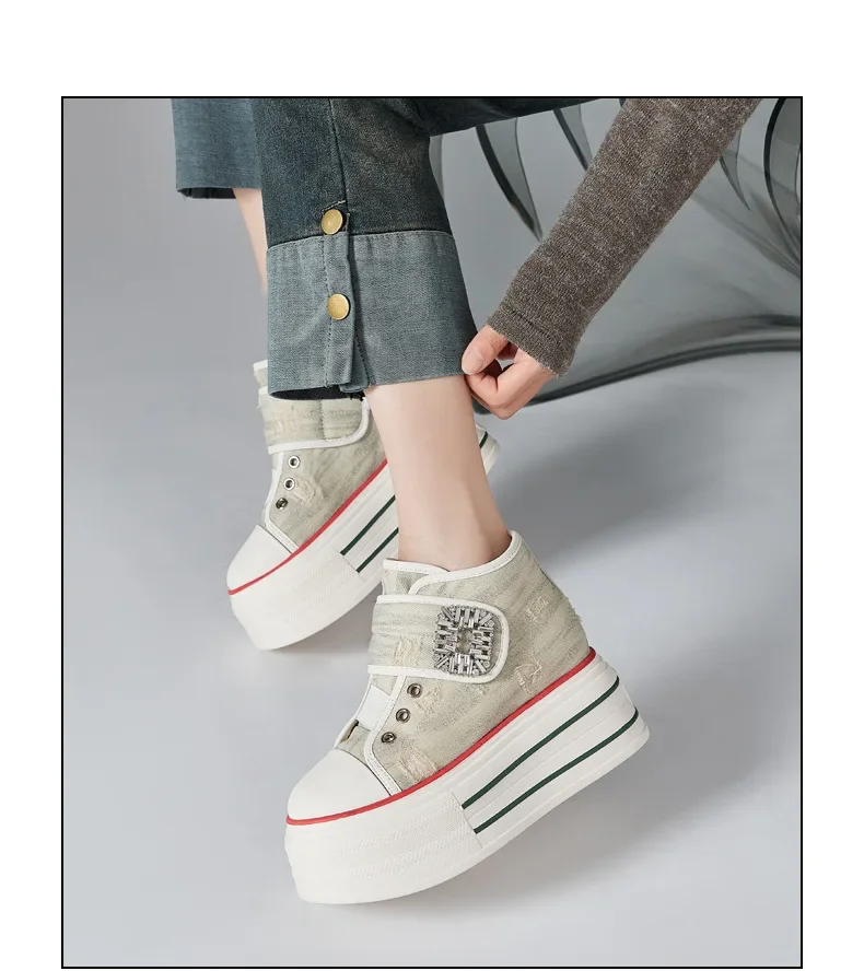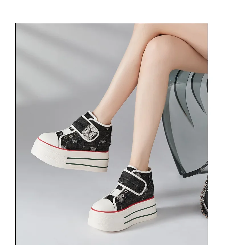 8.5cm Denim Canvas Crystal Women 2024 Fashion Hook&Loop Spring Ankle Boots Platform Wedge Lady Autumn Fashion High Brand Shoes