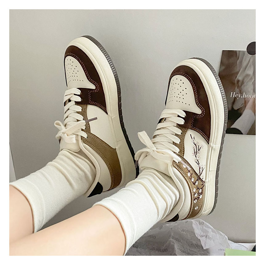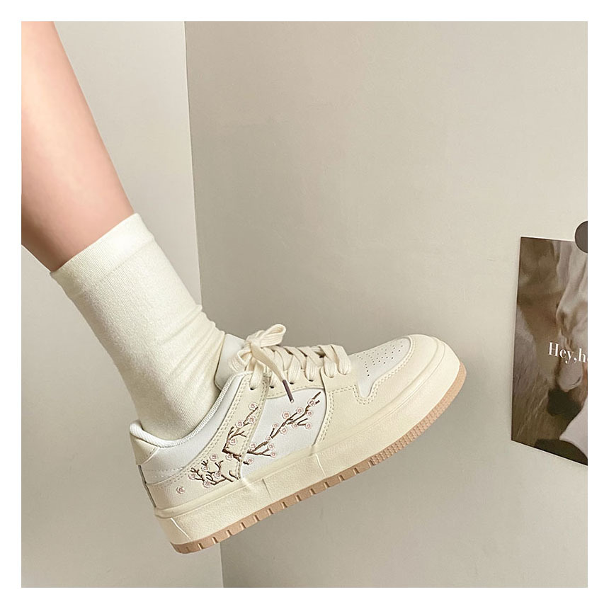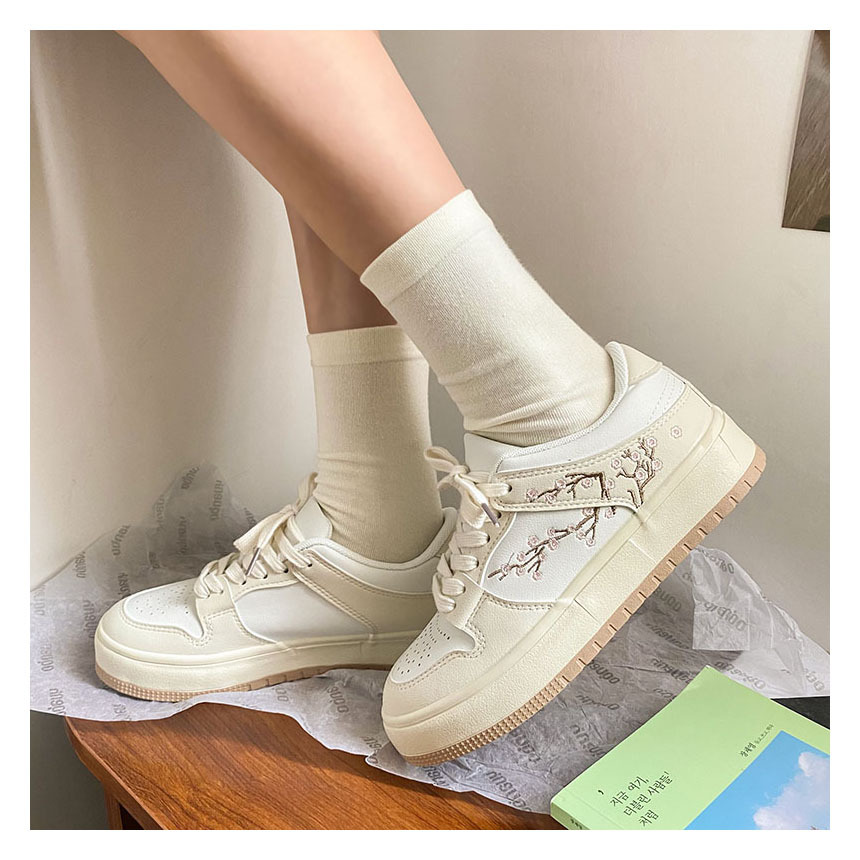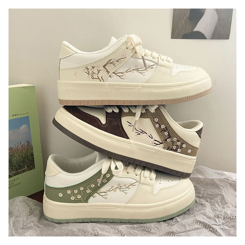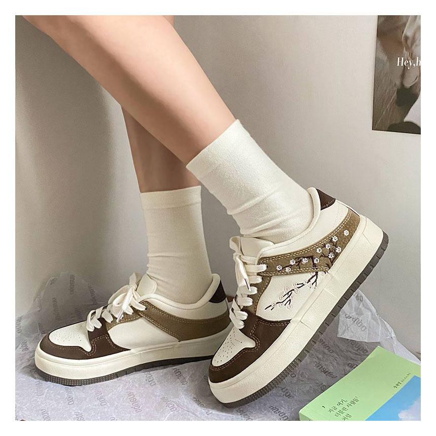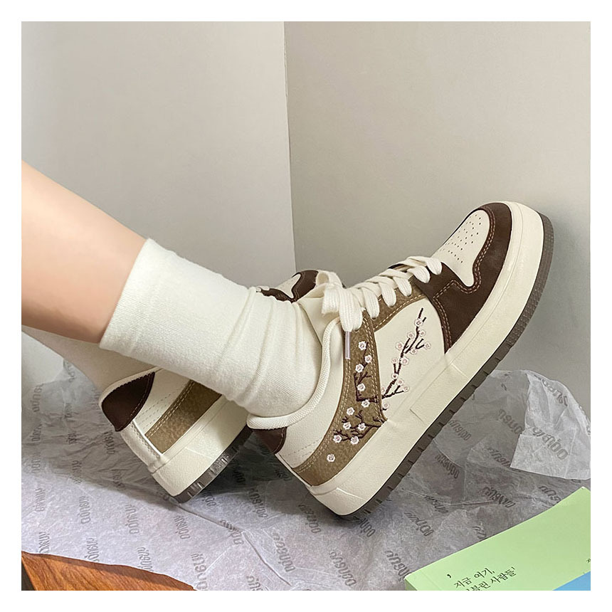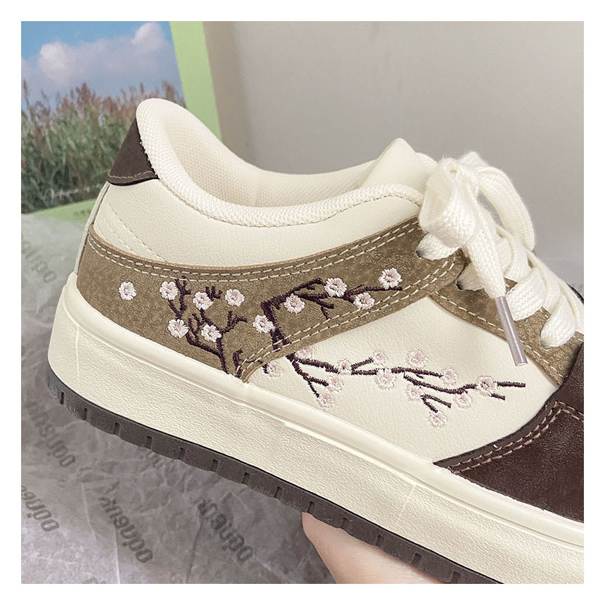 Autumn Flower Embroidery Design Women's Shoes Brown Low Top Leather Ladies Casual Shoes Thick Sole Sneakers 24-79