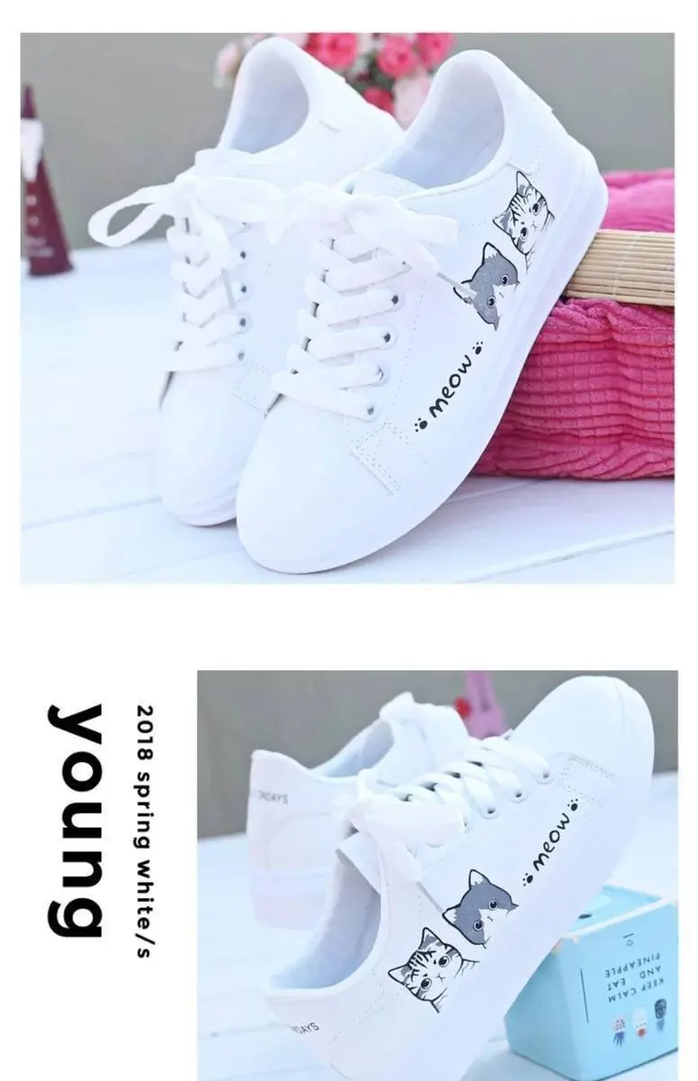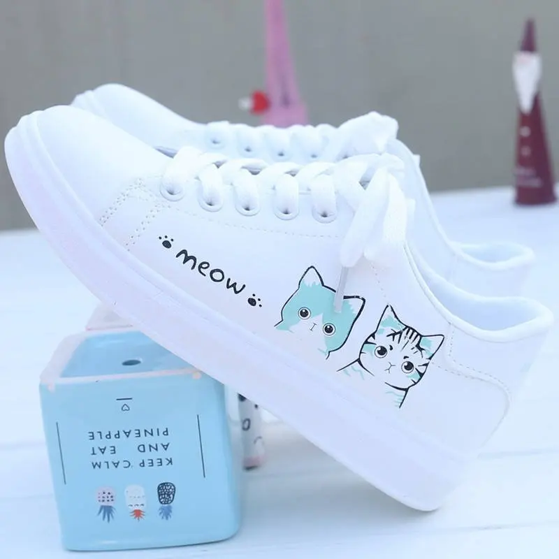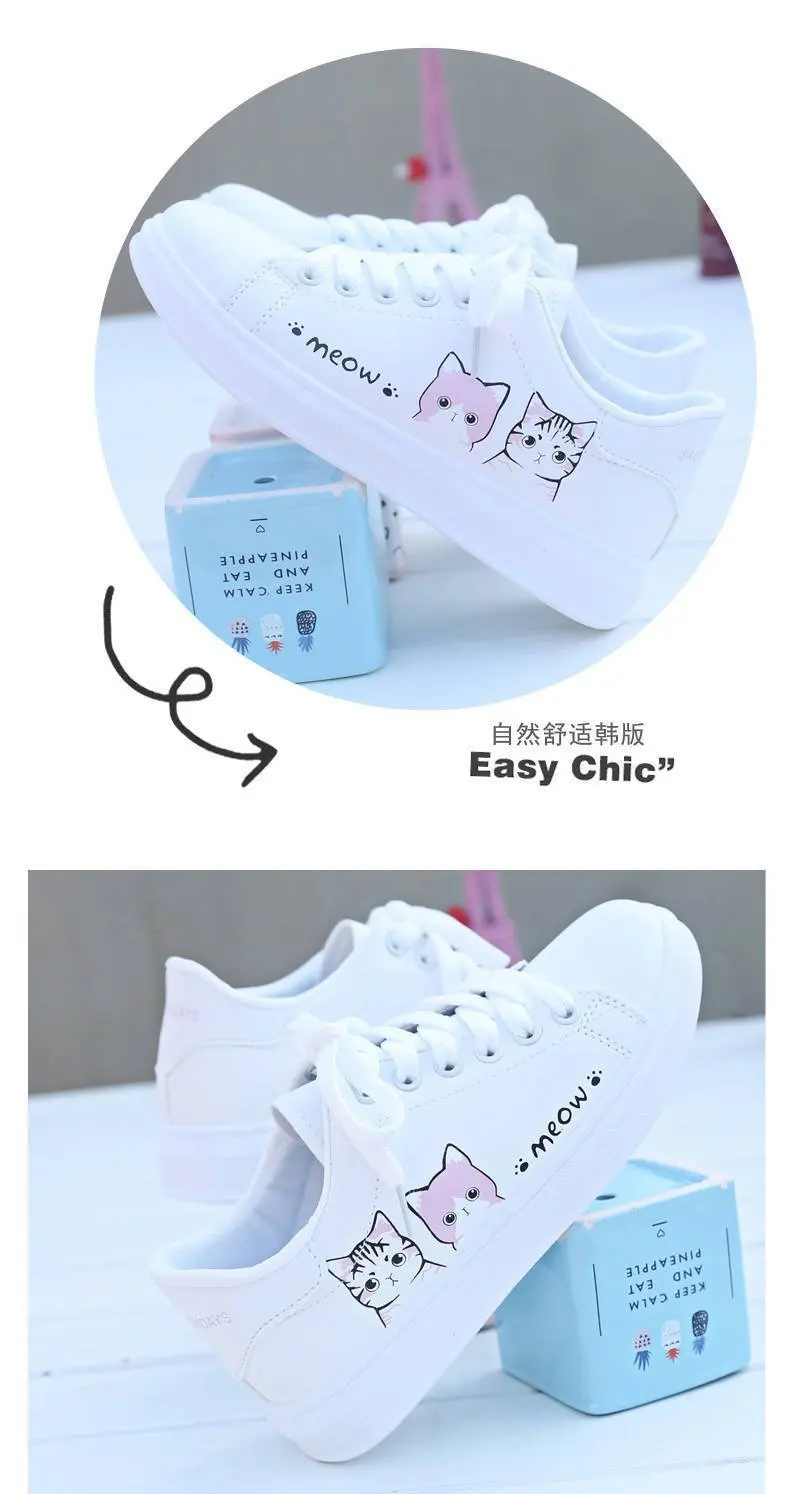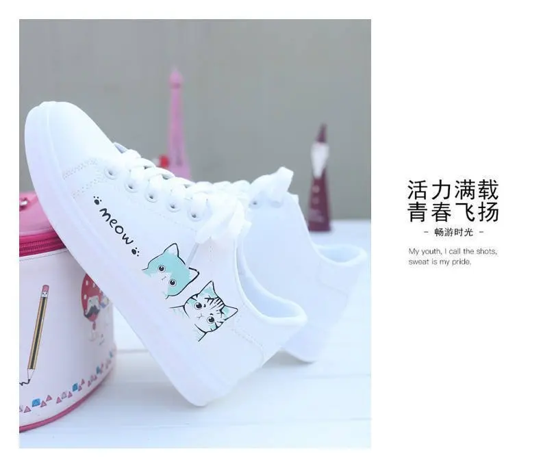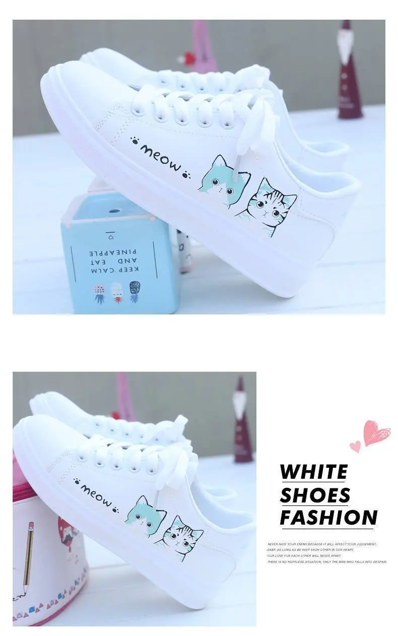 Cat Pattern Shoes for Women White Cartoon Women Sneakers Pu Vulcanized Shoes Kawaii Design Female Sneaker Shoes Zapatillas Mujer