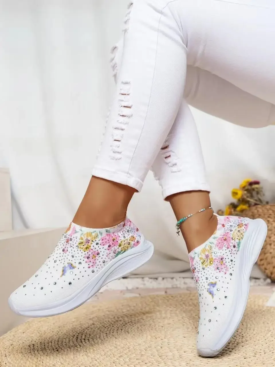 High Quality Plus Size 43 Women Shoes Comfort Breathable Casual Sneakers Women Fashion Rhinestone Flat Shoes for Women 2024