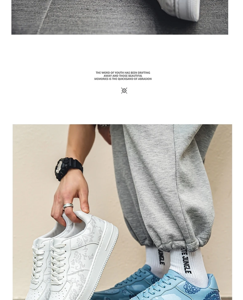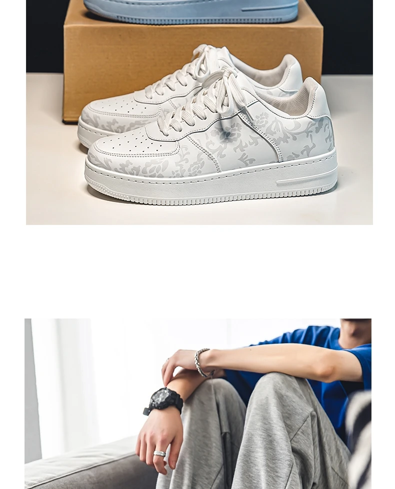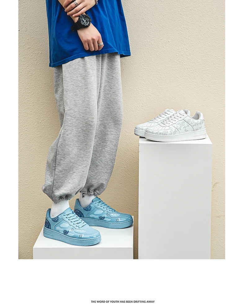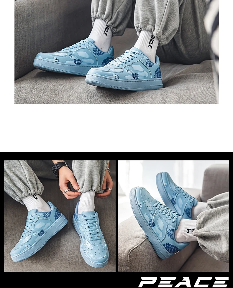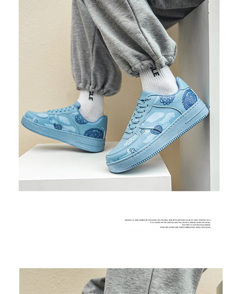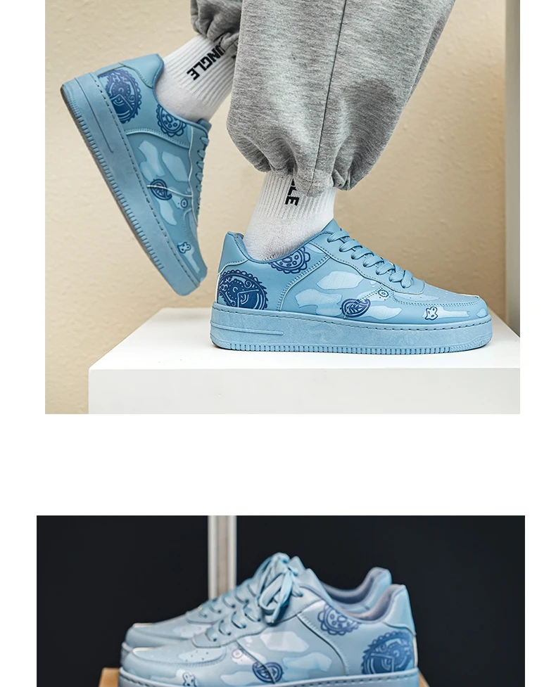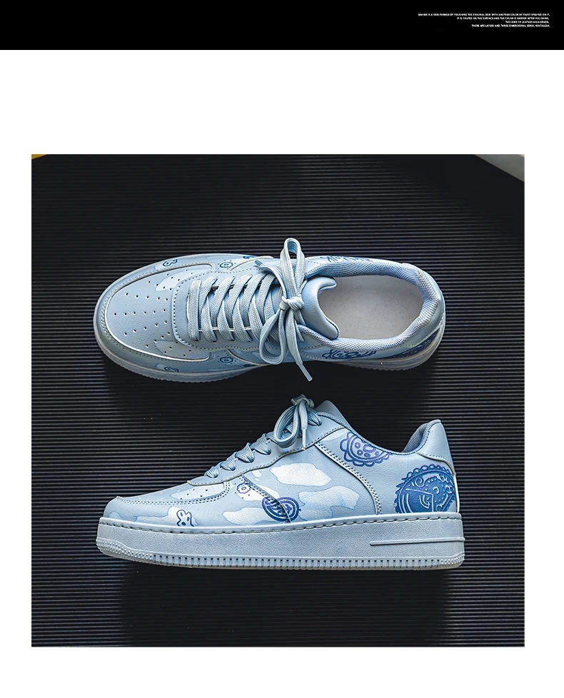 HKDQ Fashion Print Blue Men's Skateboard Shoes Leather Breathable Man Casual Sneakers Platform Non-slip Men Skateboarding Shoes