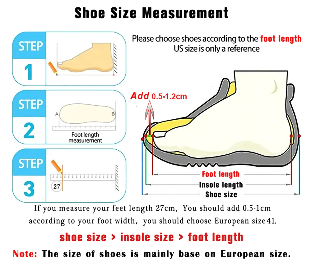 Please note 1. Choose the size according to your foot length (don't/don't choose the size according to the regular size in your country!!! 2. If your feet are a bit wide or the instep is a bit thick, it is better to choose a size