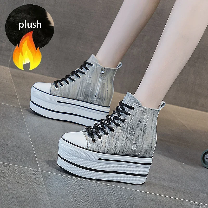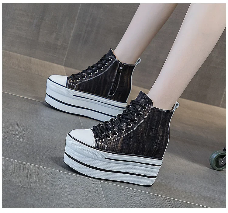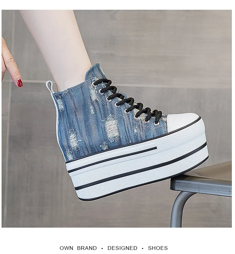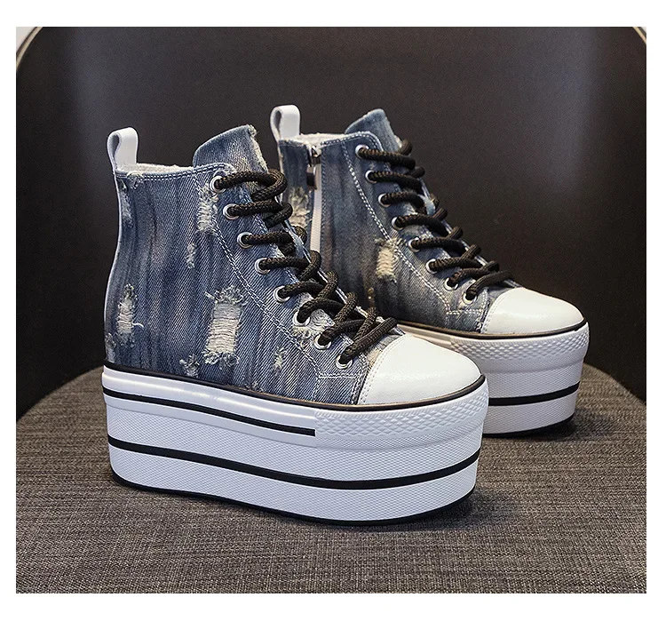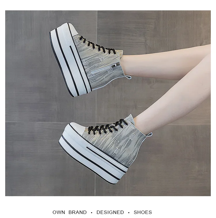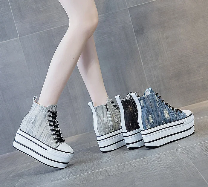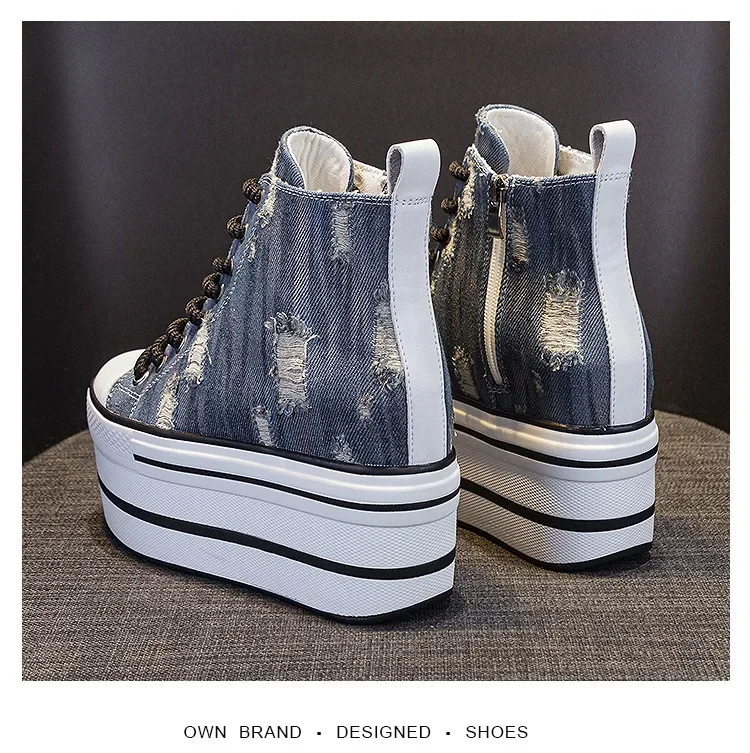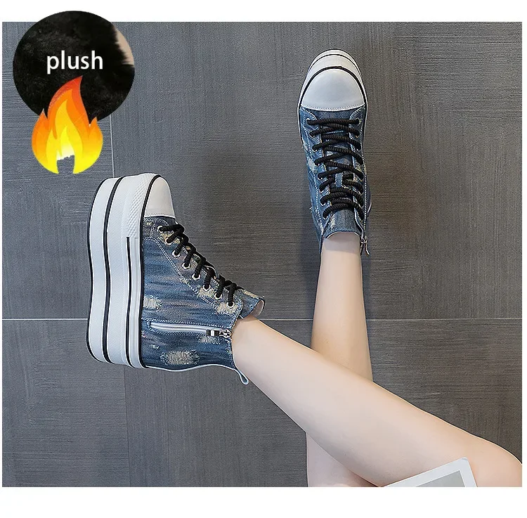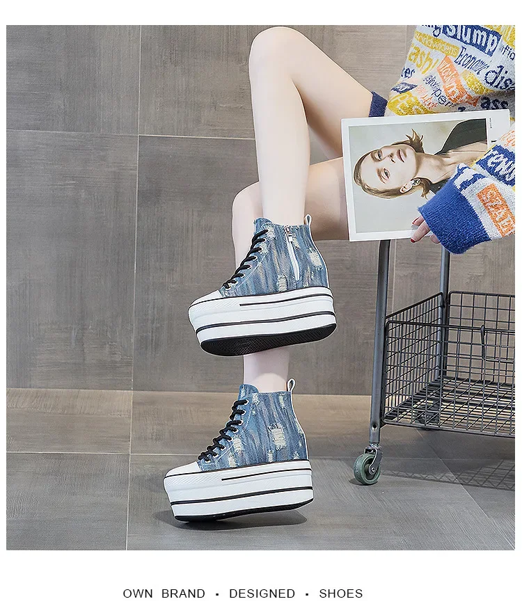 Hot sales 11CM Denim Genuine Leather Women 2024 Fashion Spring Ankle Boots Platform Wedge Autumn High Brand Hidden Heels Shoes