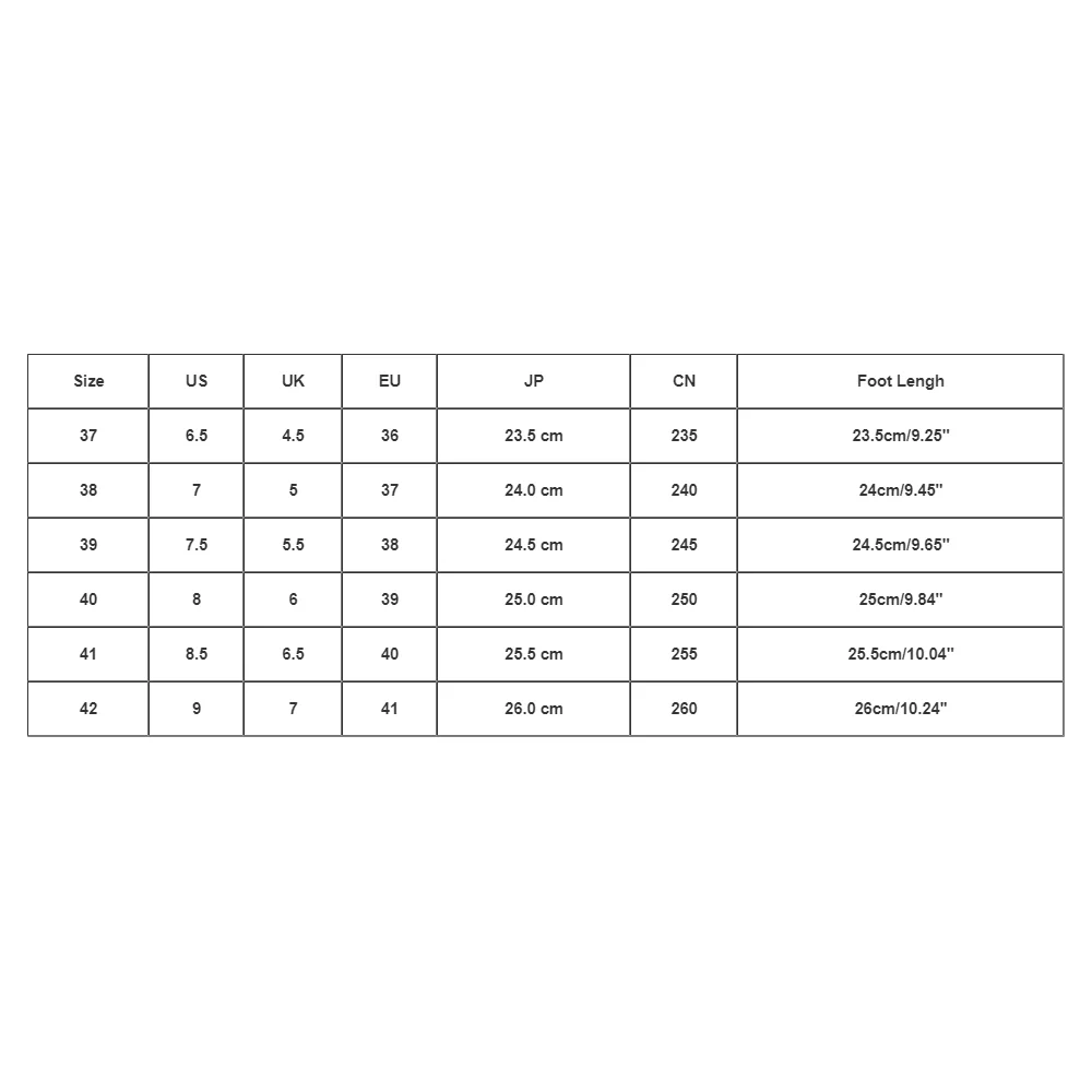 | Size:38 | US:7 | UK:5 | EU:37 | JP:24.0 cm | CN:240 | Foot Lengh:24cm/9.45'' |