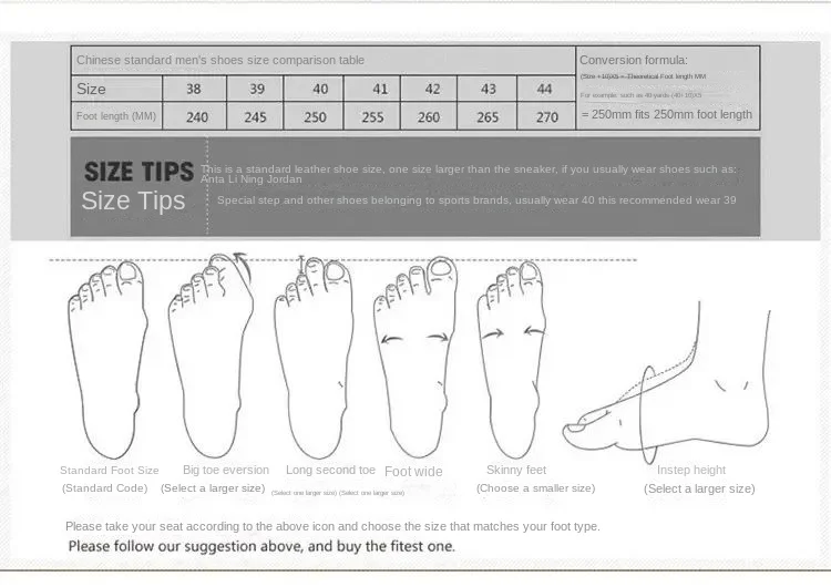 Please note 1. Choose the size according to your foot length (don't/don't choose the size according to the regular size in your country!!! 2. If your feet are a bit wide or the instep is a bit thick, it is better to choose a size