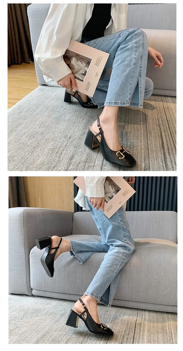 Metal Buckle Temperament High Heels Women's 2023 New Fashion Thick Heel Mary Jane Small Leather Shoes Square Toe Shoes