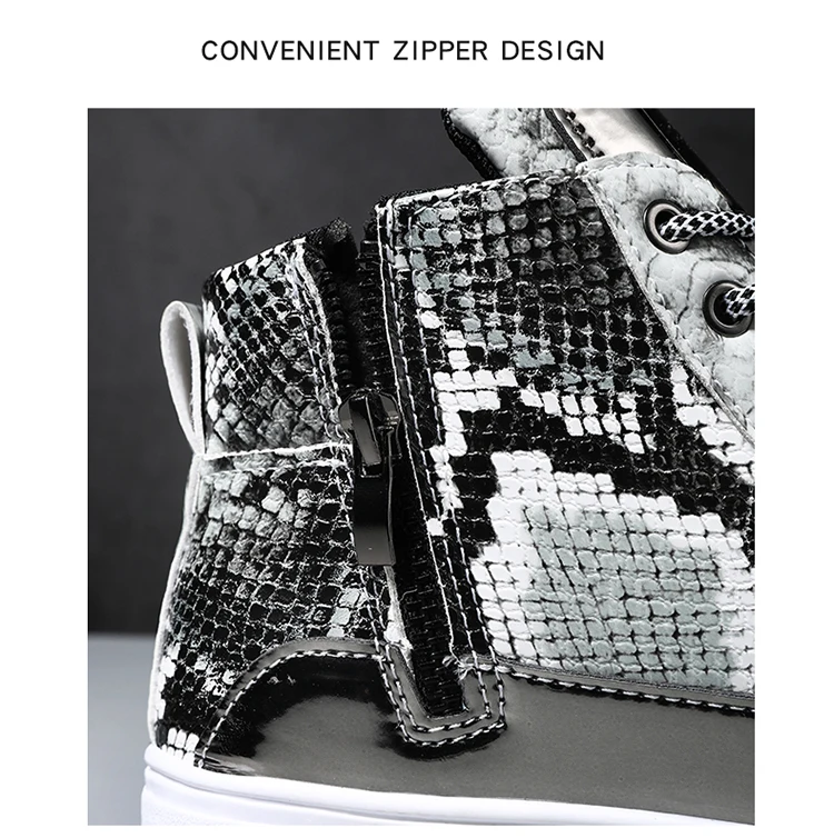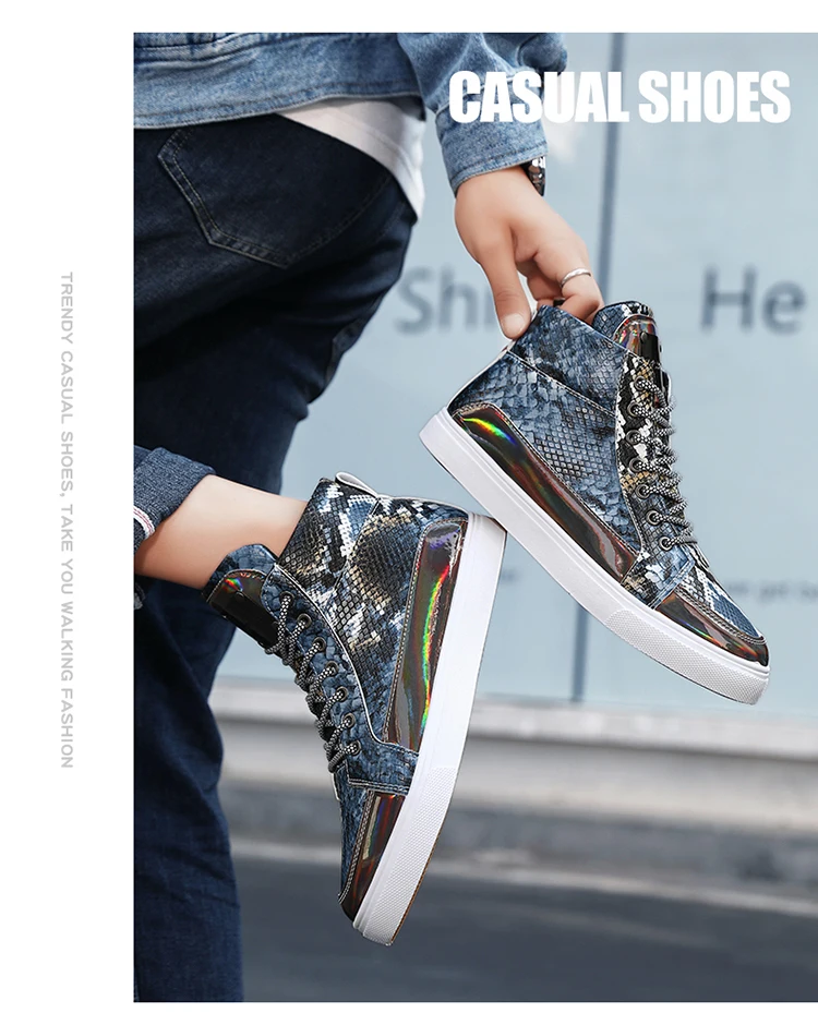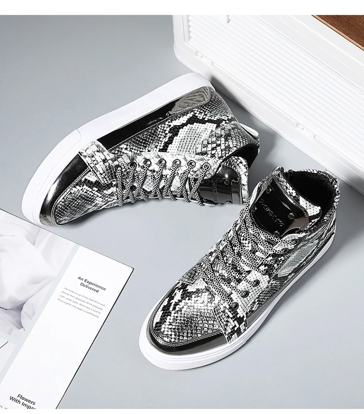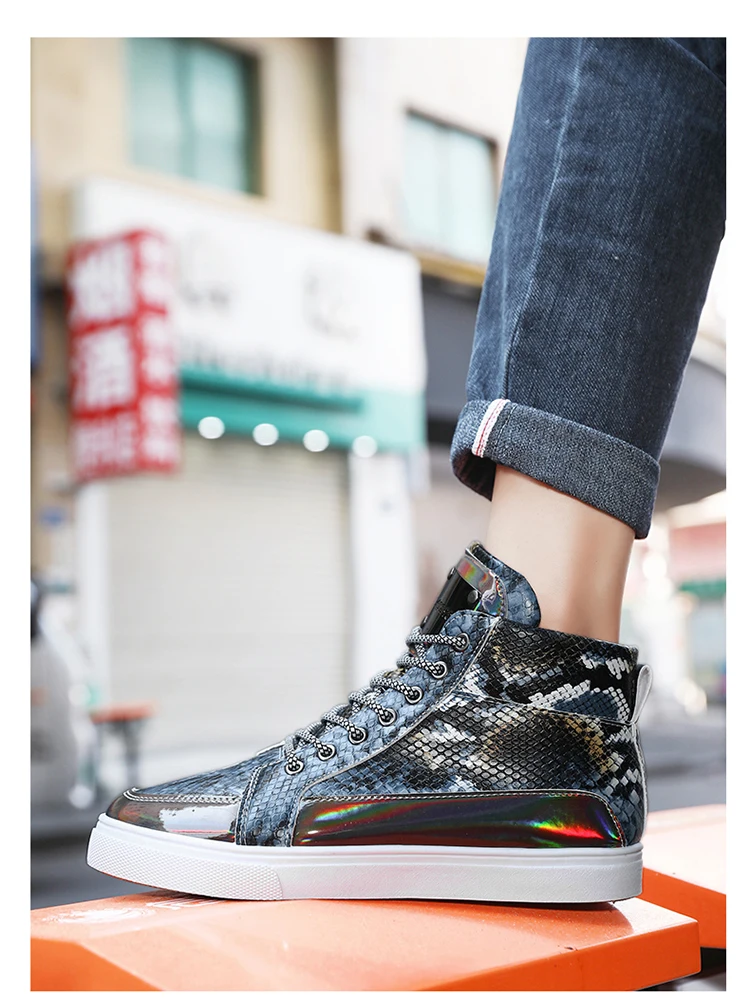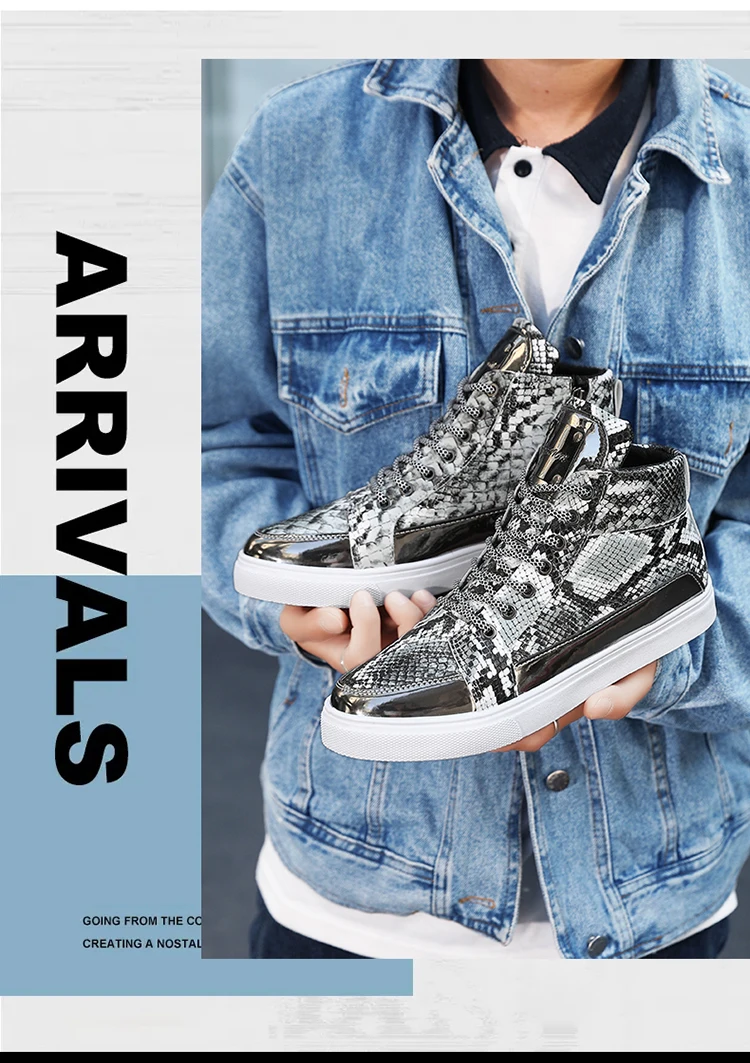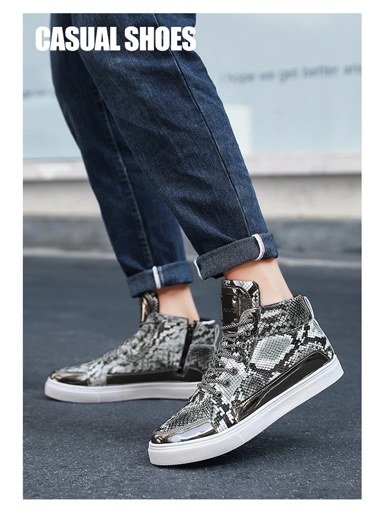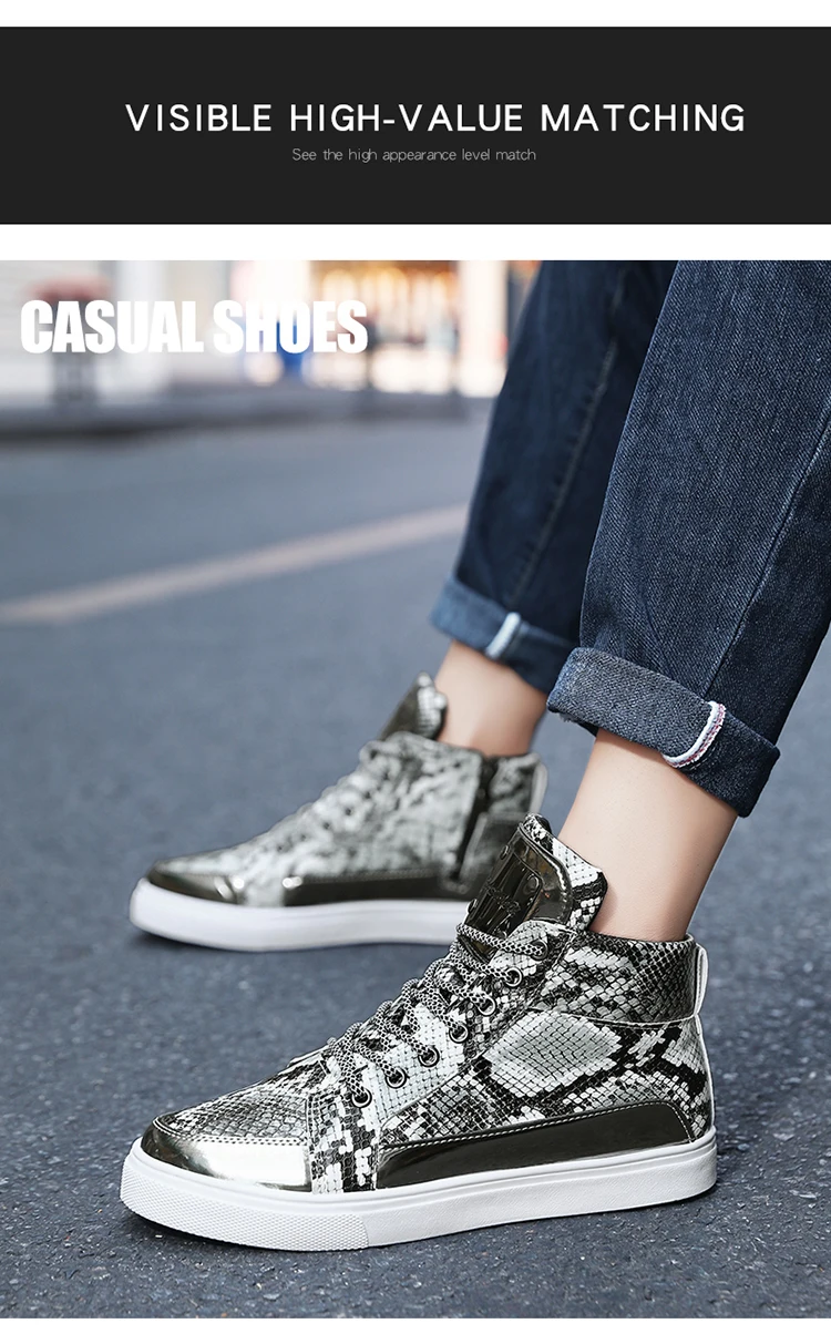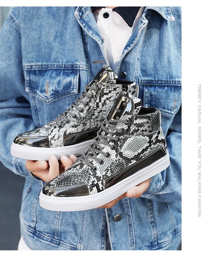 New Design Silver Men High Top Sneakers Fashion Snake Leather Men Vulcanized Shoes Comfortable Anti-slip Men Skateboarding Shoes
