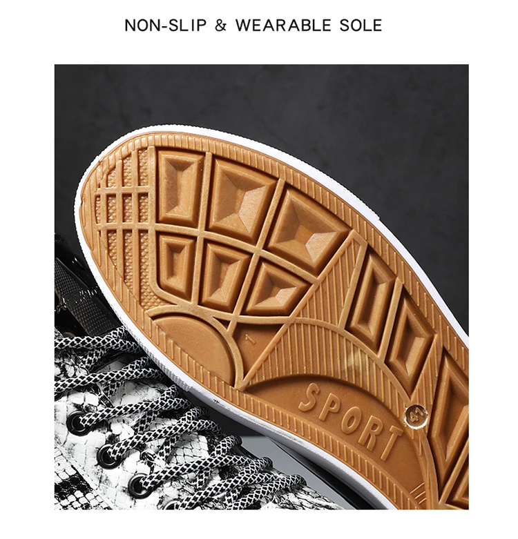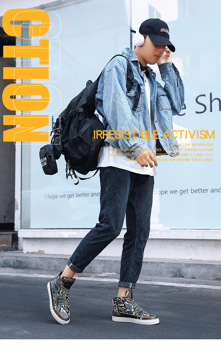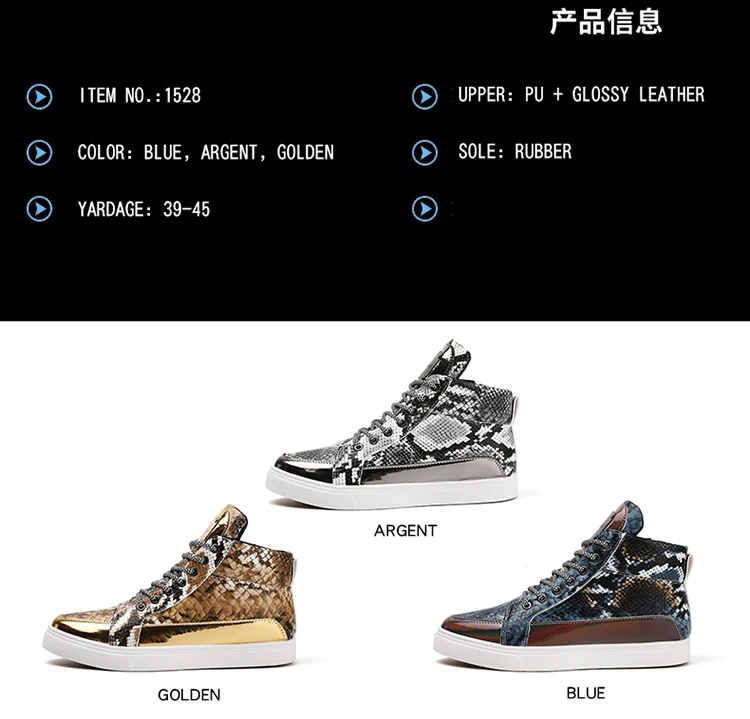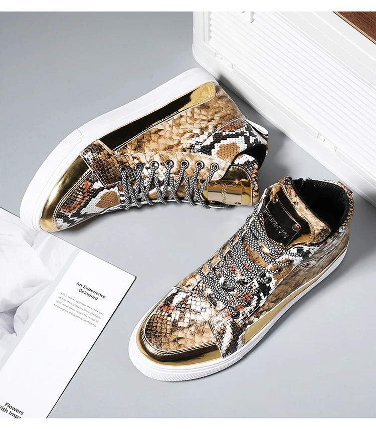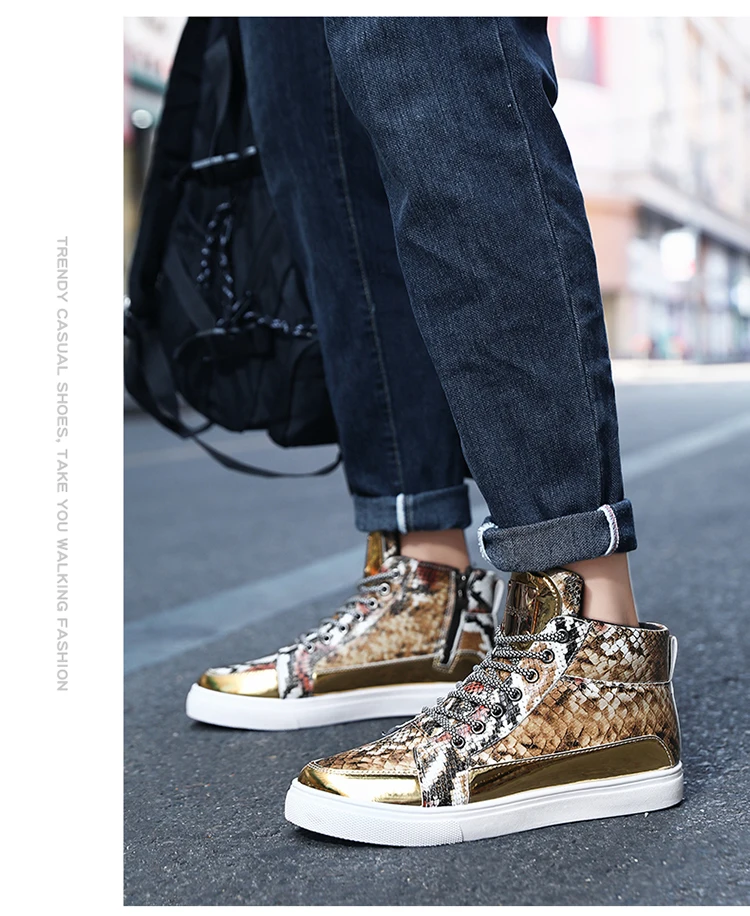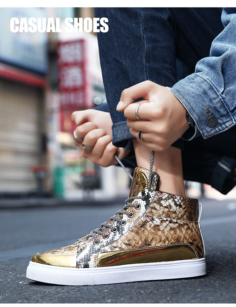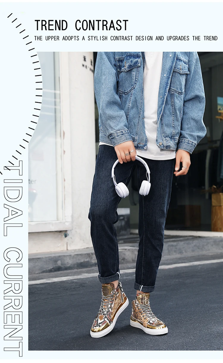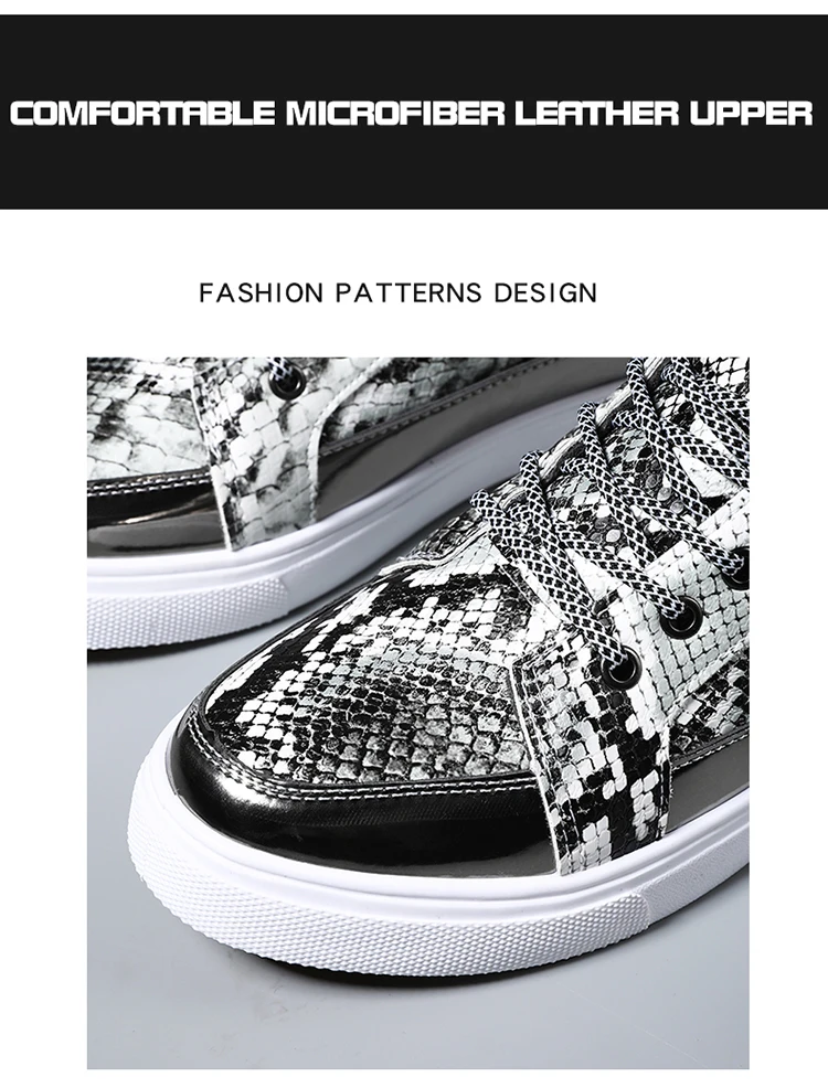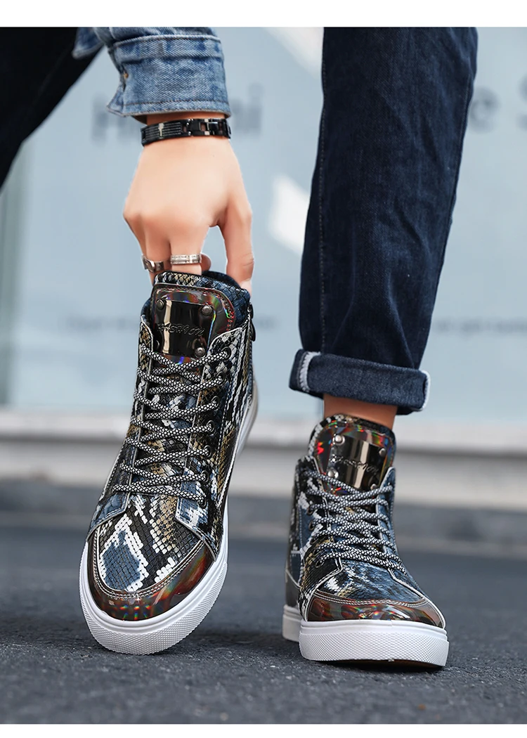 New Design Silver Men High Top Sneakers Fashion Snake Leather Men Vulcanized Shoes Comfortable Anti-slip Men Skateboarding Shoes