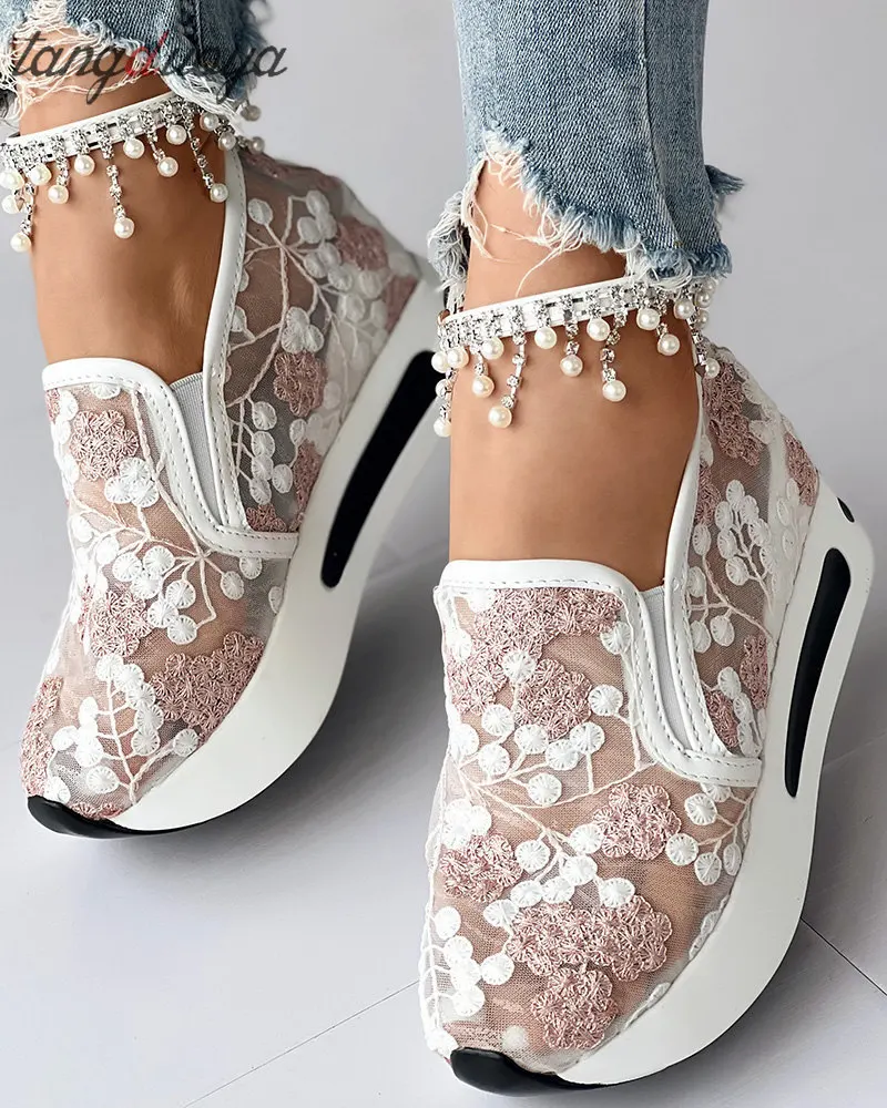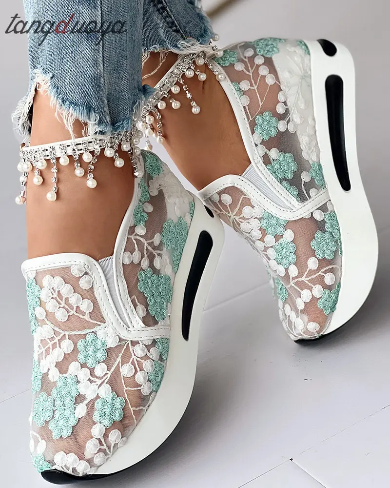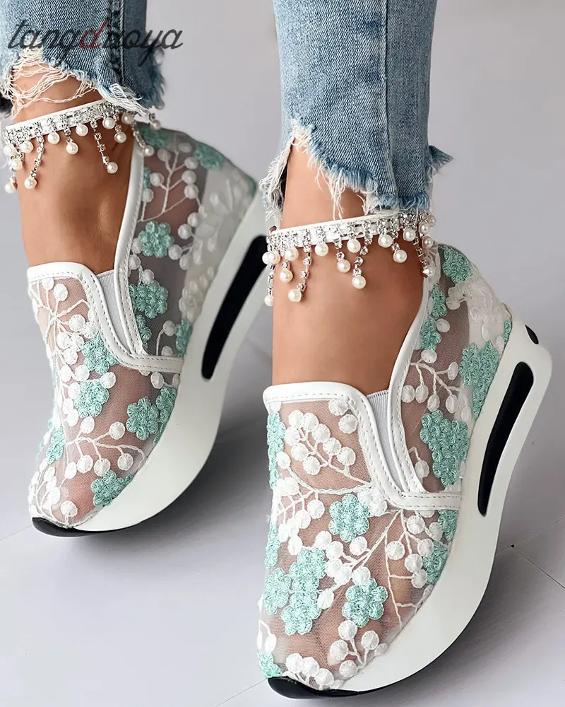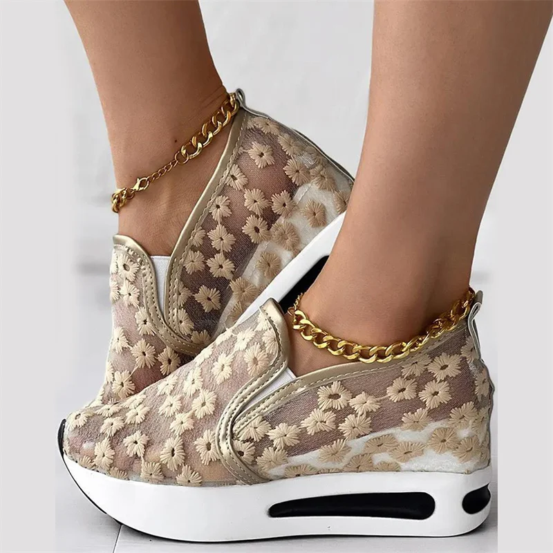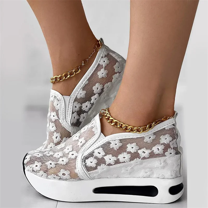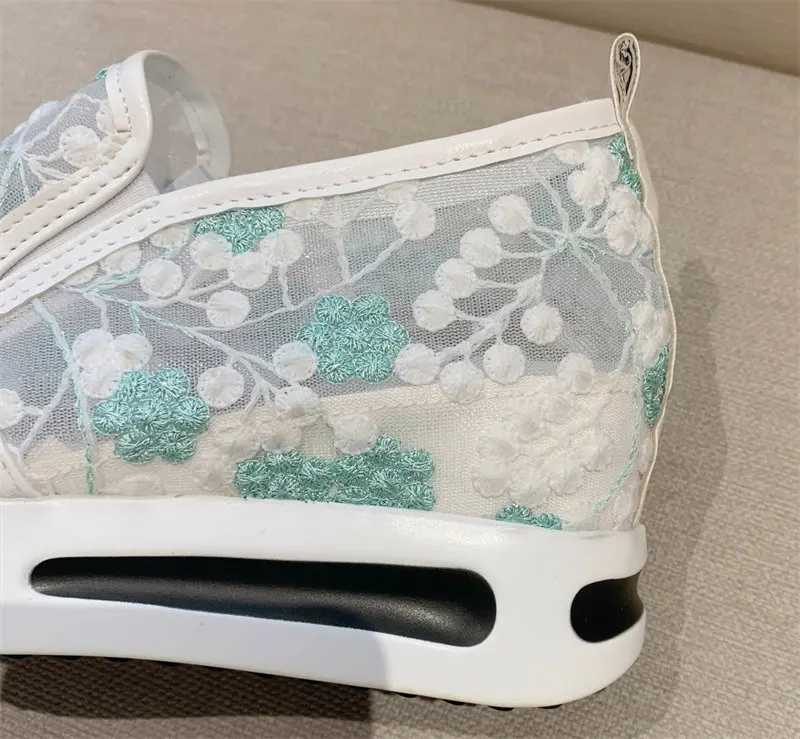 Platform Wedges women's Sneakers Floral Embroidery Mesh Sneakers For Women Slip On Casual Comfy Heeled Shoes Woman white size 42