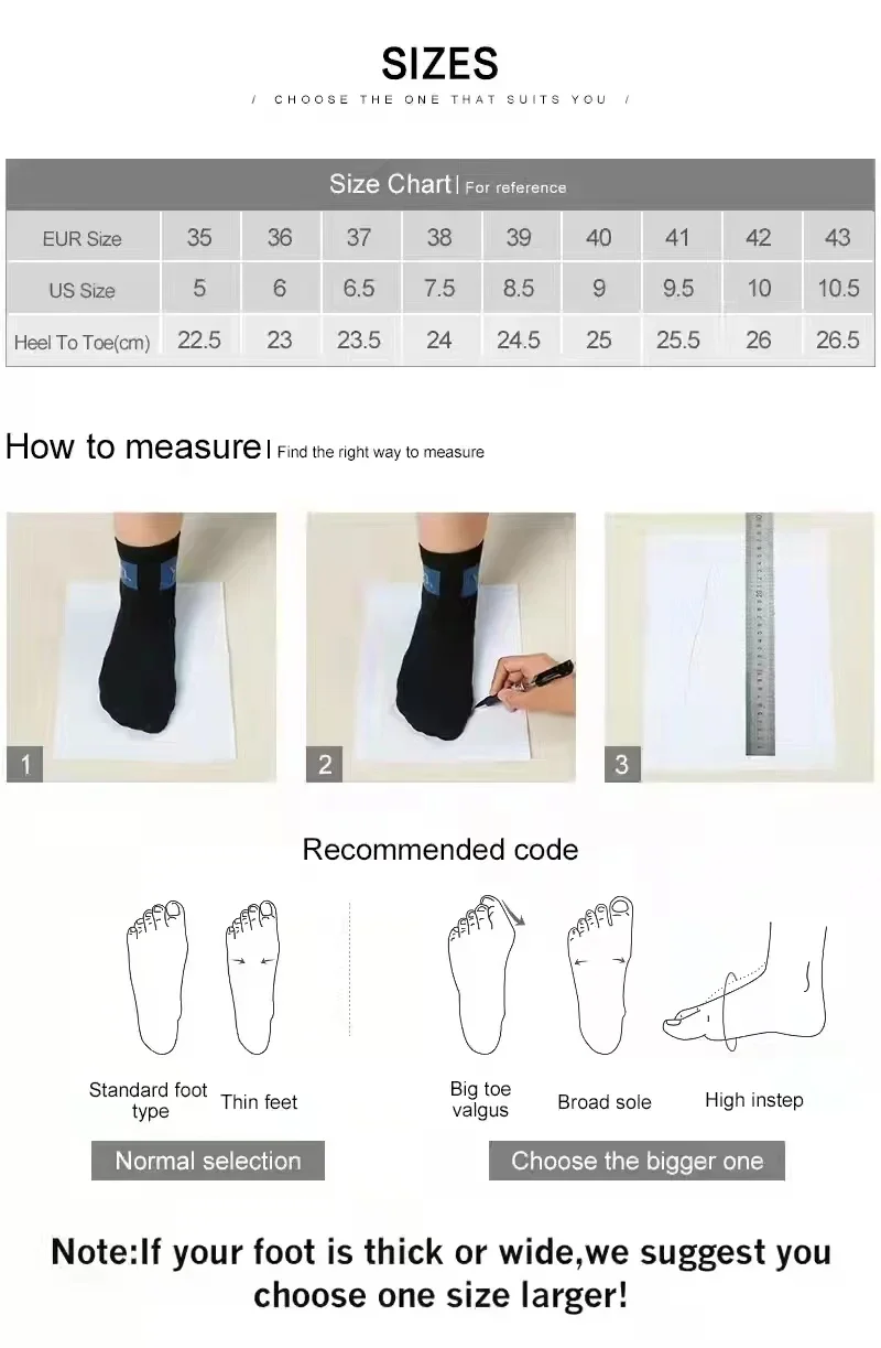 Please note 1. Choose the size according to your foot length (don't/don't choose the size according to the regular size in your country!!! 2. If your feet are a bit wide or the instep is a bit thick, it is better to choose a size