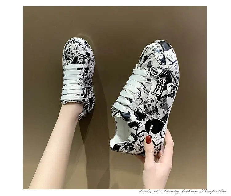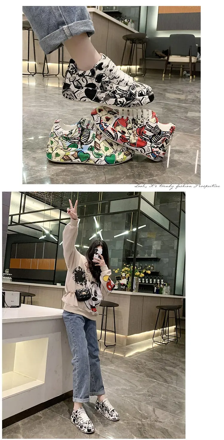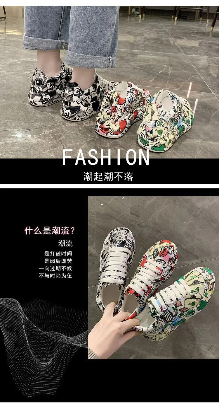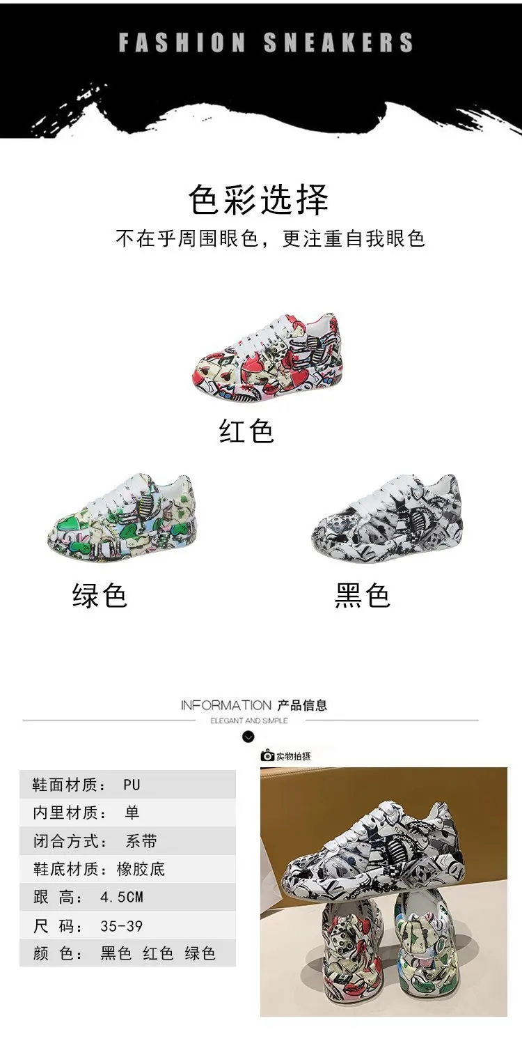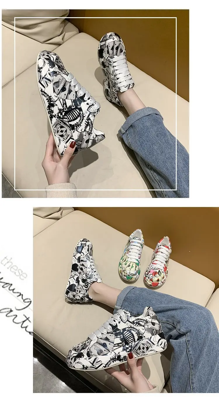 Spring and Summer New Style Hand-painted Graffiti Shoes Female White Shoes Leather Thick-soled Fashion Shoes Female Sports Shoes