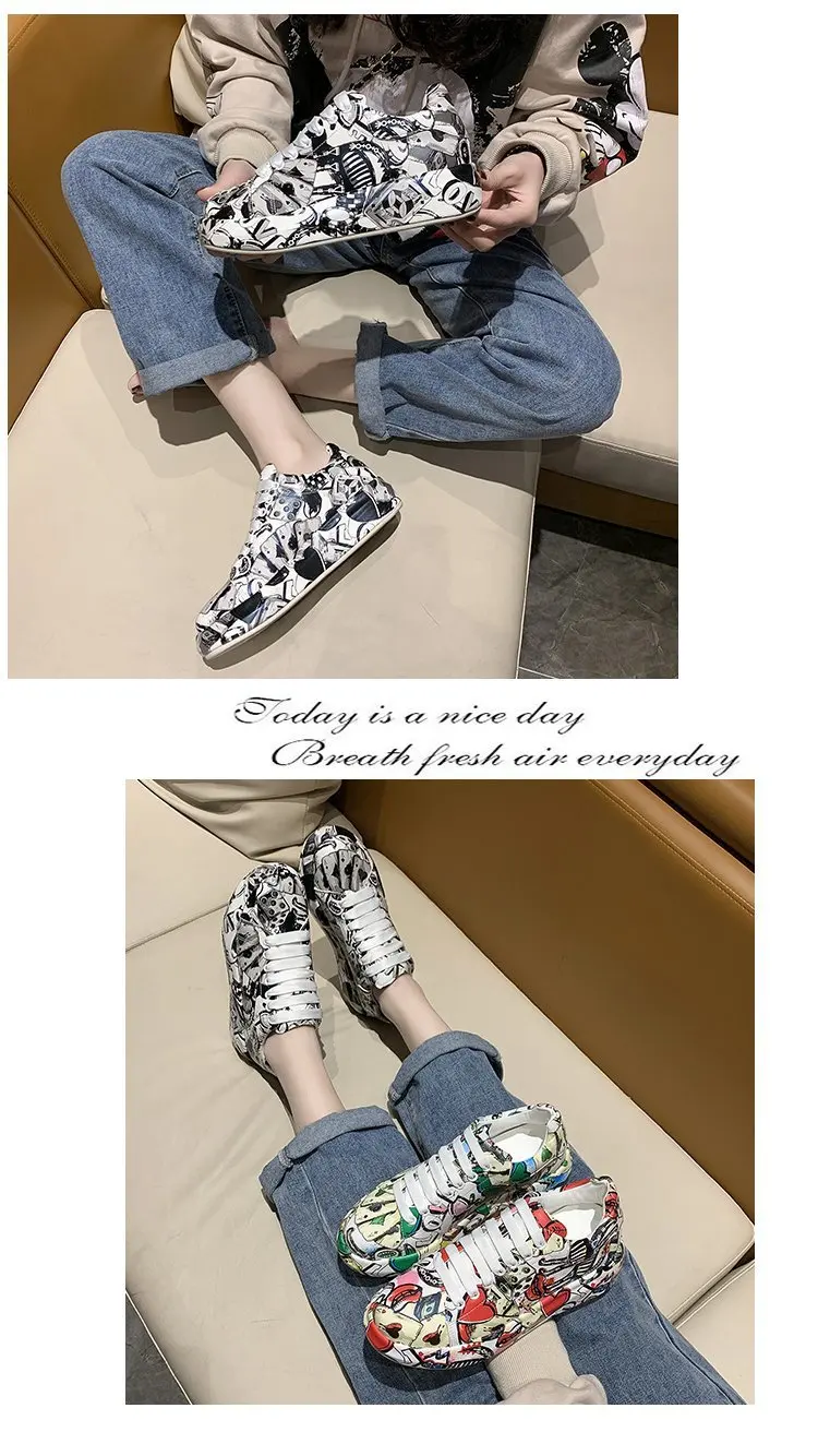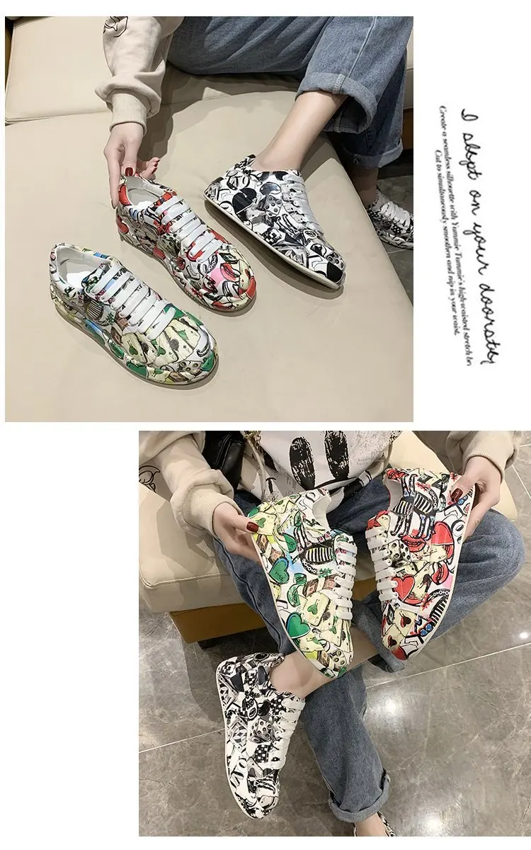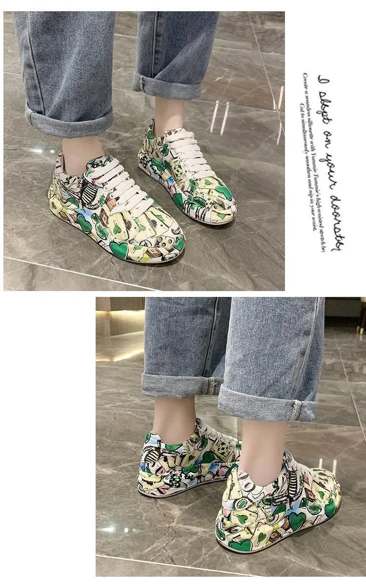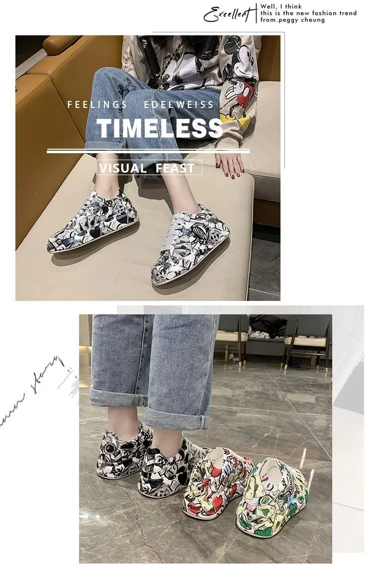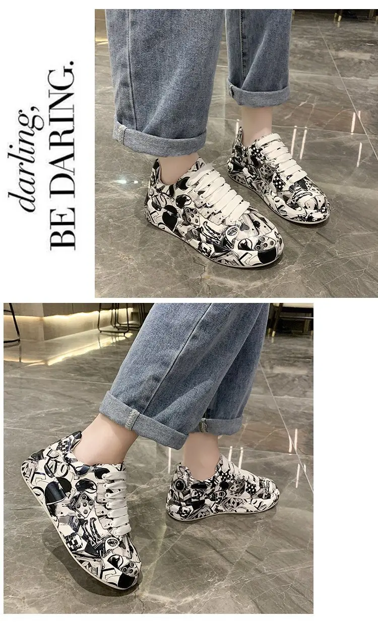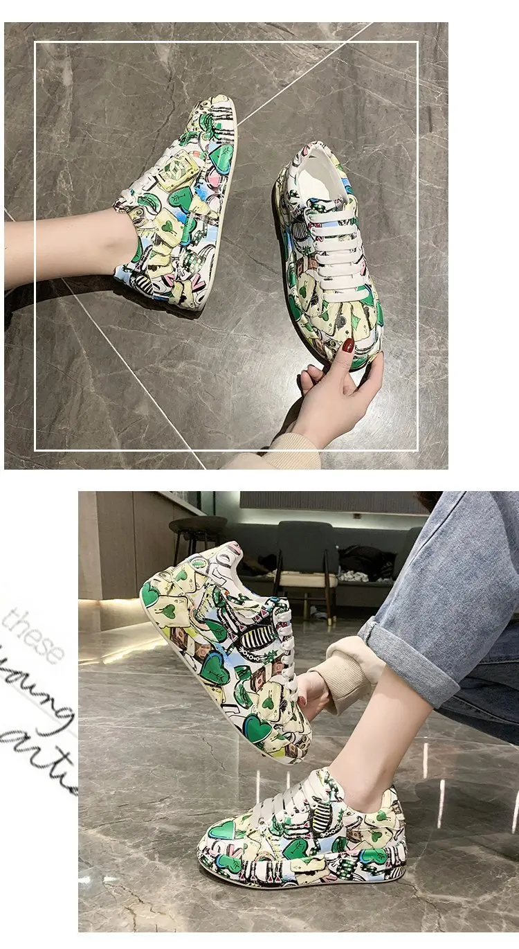 Spring and Summer New Style Hand-painted Graffiti Shoes Female White Shoes Leather Thick-soled Fashion Shoes Female Sports Shoes