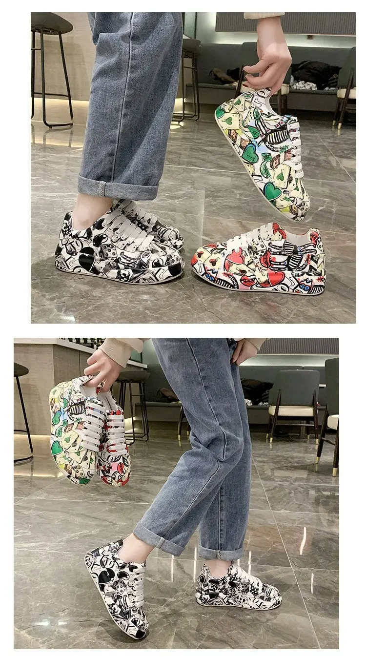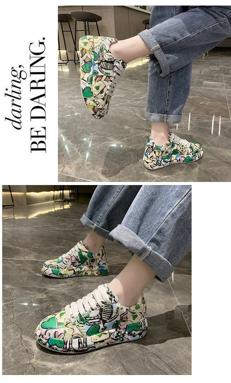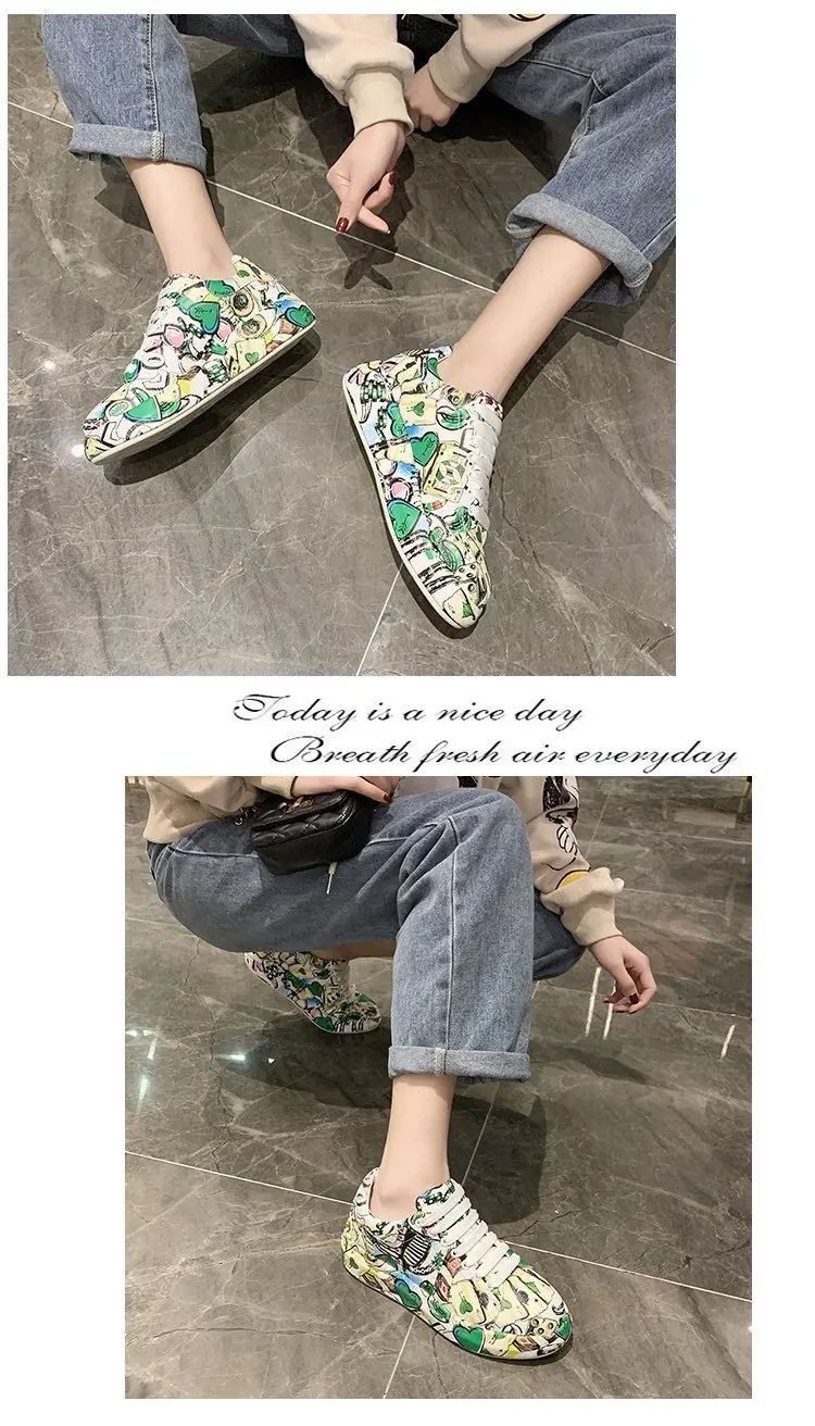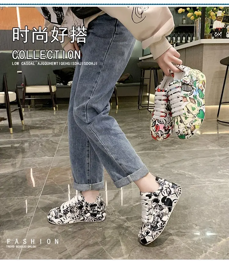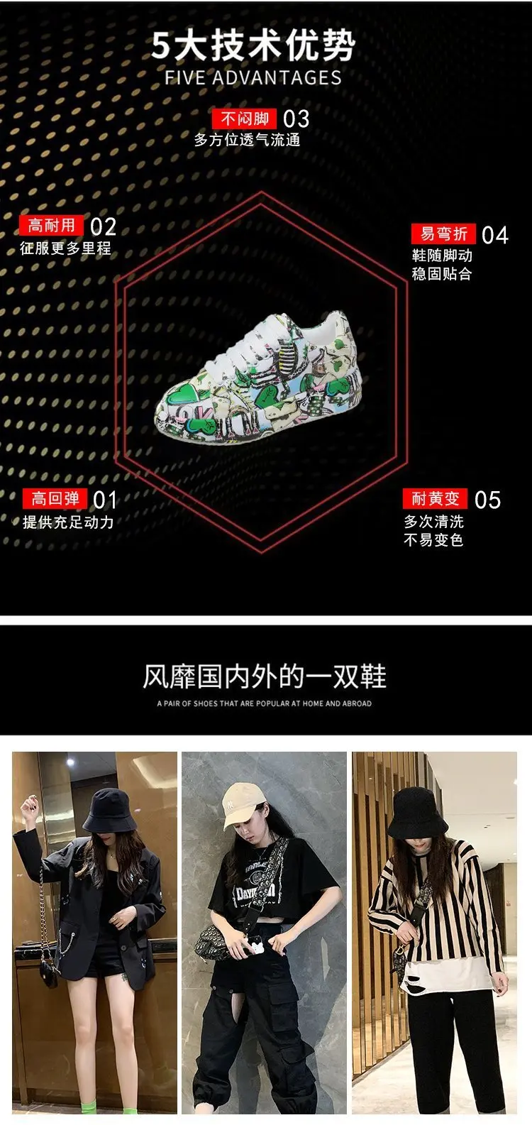 Spring and Summer New Style Hand-painted Graffiti Shoes Female White Shoes Leather Thick-soled Fashion Shoes Female Sports Shoes