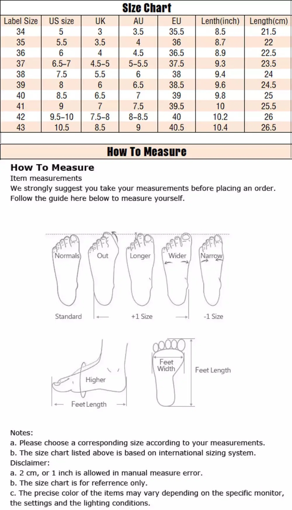 Please note 1. Choose the size according to your foot length (don't/don't choose the size according to the regular size in your country!!! 2. If your feet are a bit wide or the instep is a bit thick, it is better to choose a size