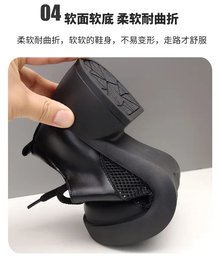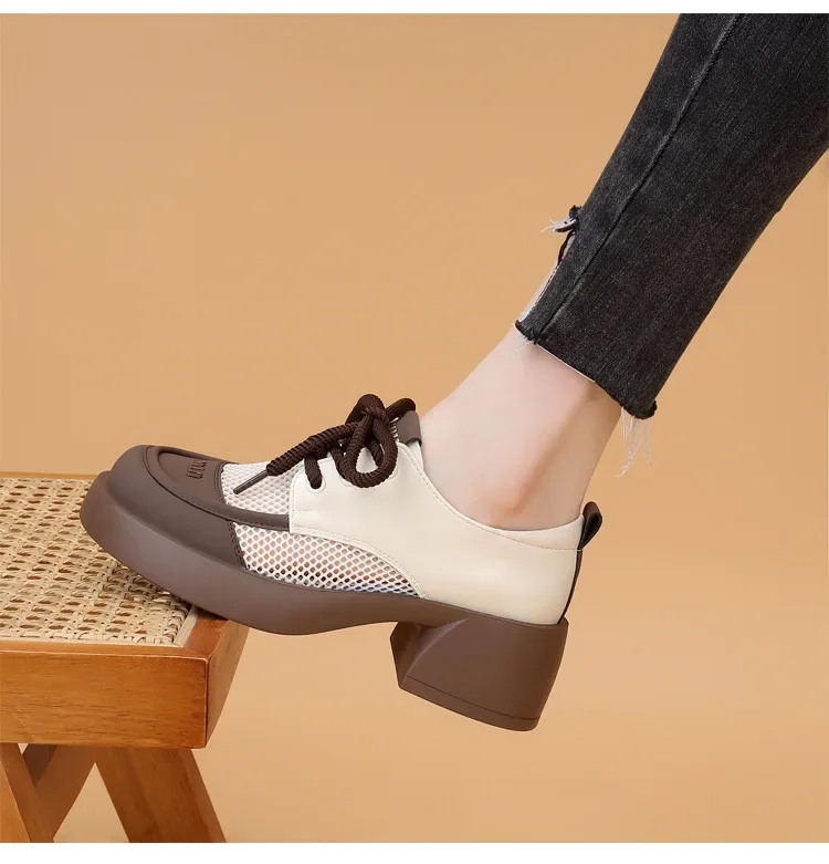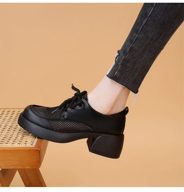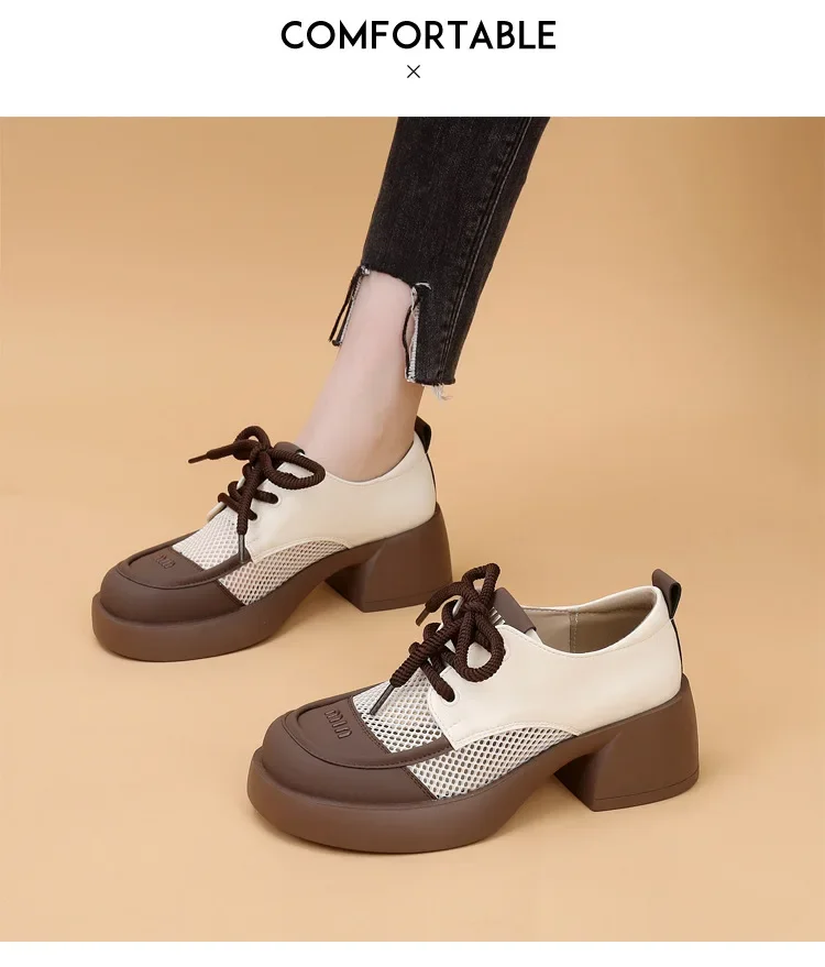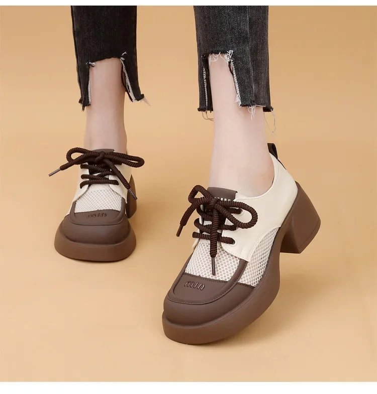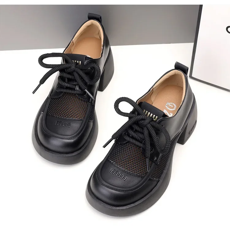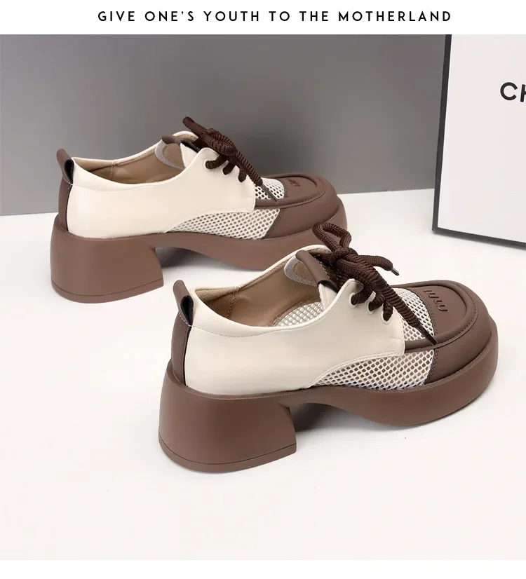 Women Chunky Platform Pumps Female Spring Pu Leather High Heels Loafers Woman Round Toe Lace Up Breathable Hollow Single Shoes