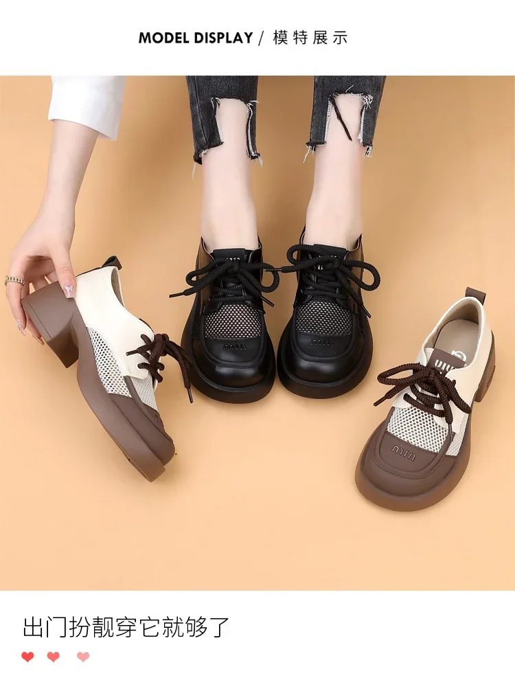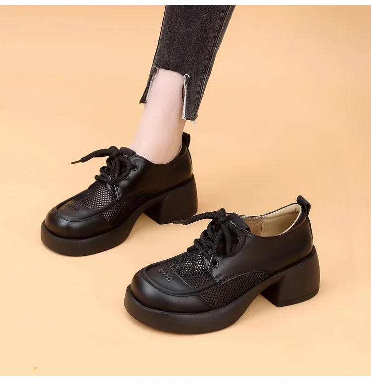 Women Chunky Platform Pumps Female Spring Pu Leather High Heels Loafers Woman Round Toe Lace Up Breathable Hollow Single Shoes