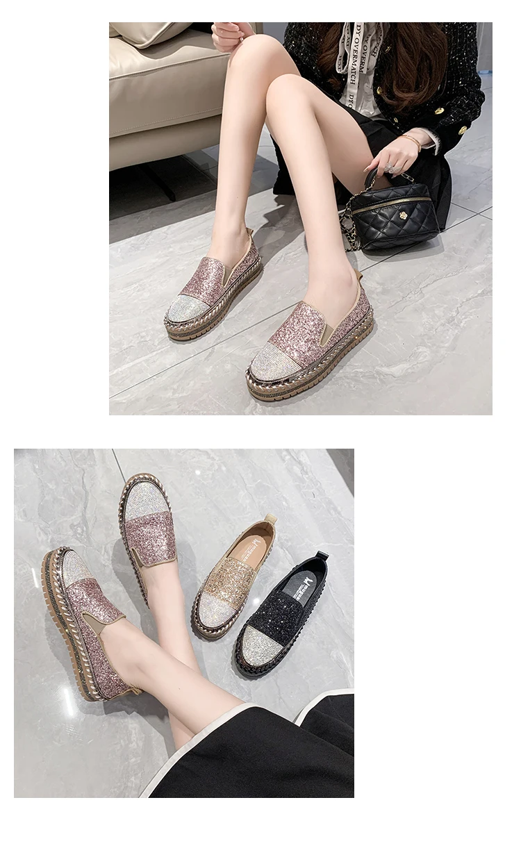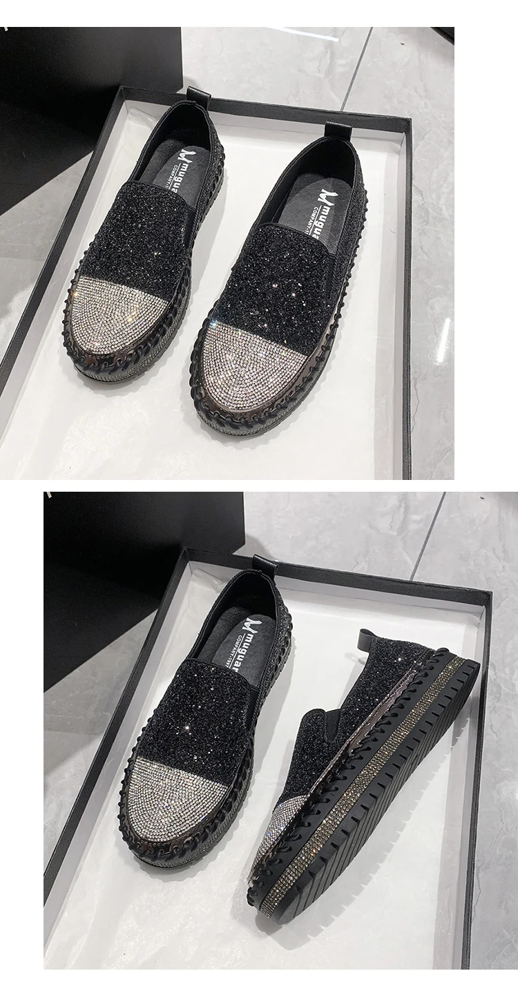 Women Shining Rhinestone Flats Loafers Slip-on Thick Botton Casual Woman Crystal Shoes Female Fashion Sneakers Sports Running