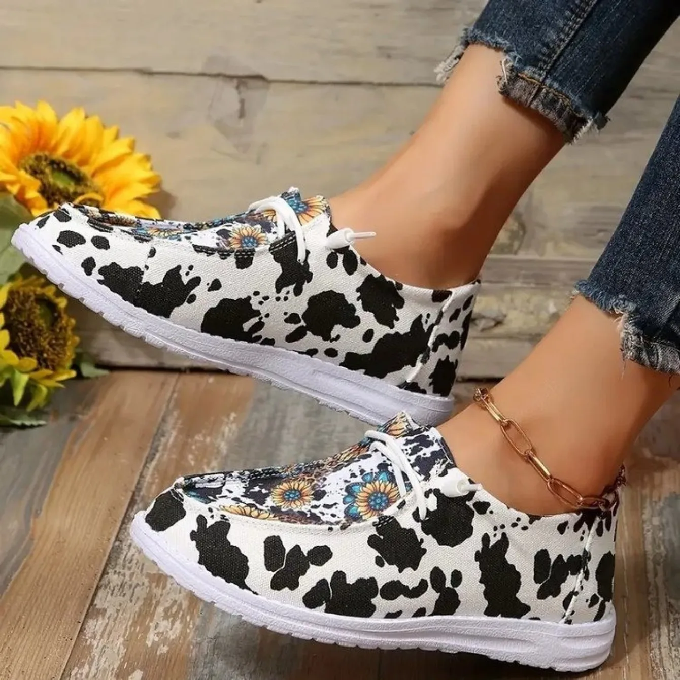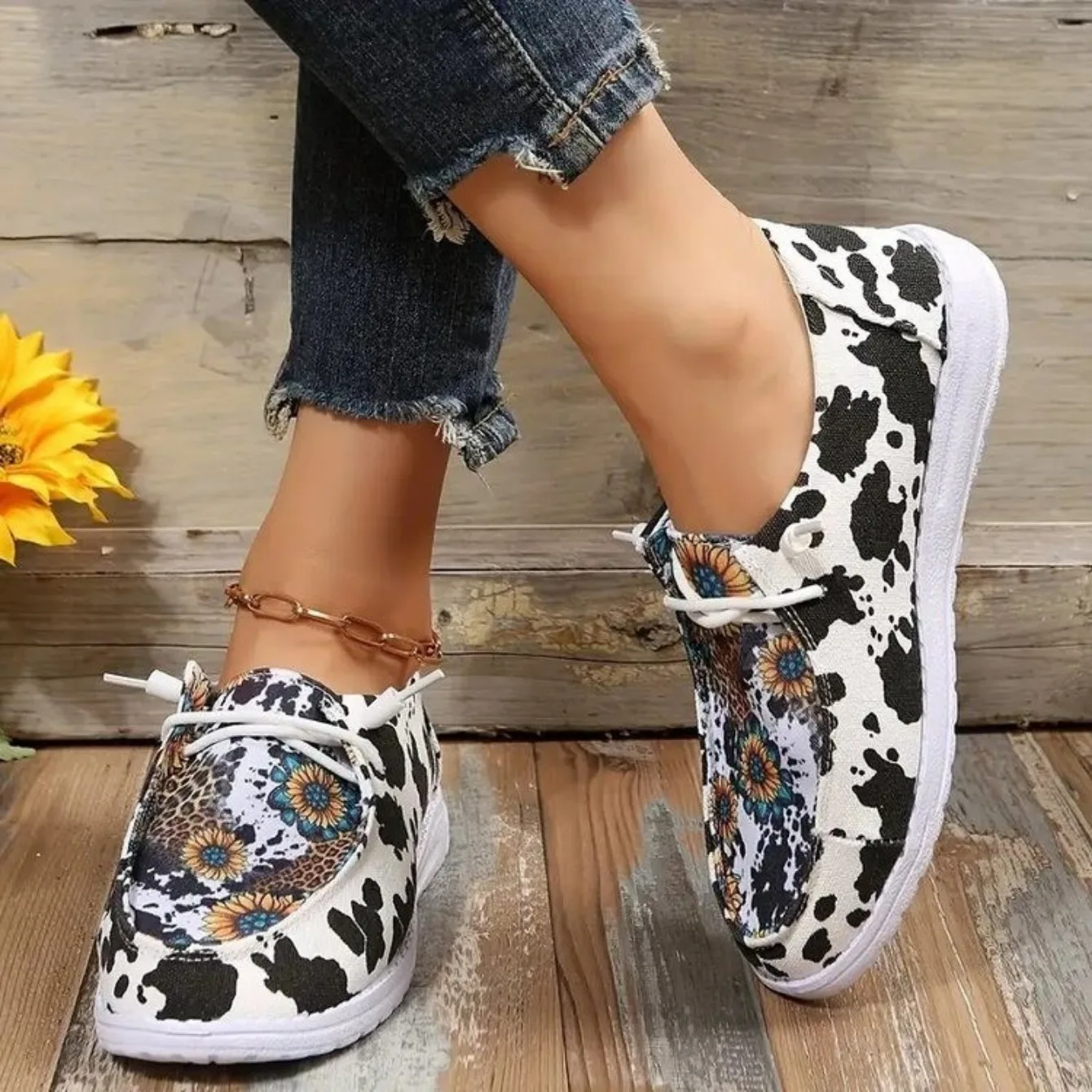 Women Sneakers Print Canvas Lightweight Slip-on Sneakers Ladies Breathable Sunflower Loafers Brand Design Casual Shoes for Women