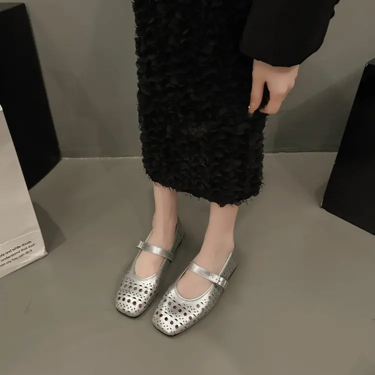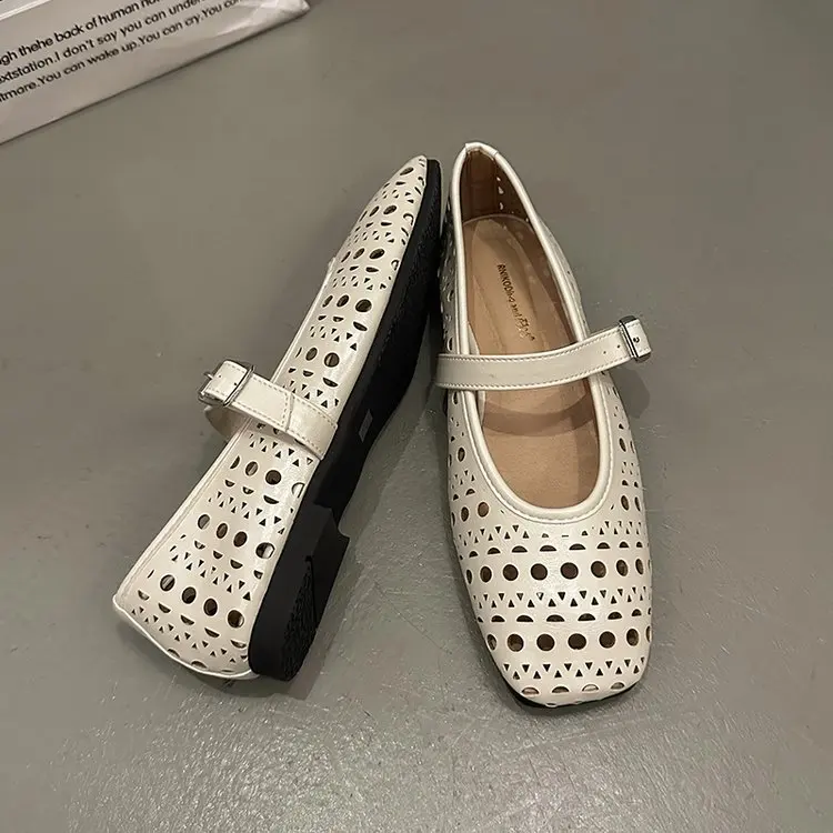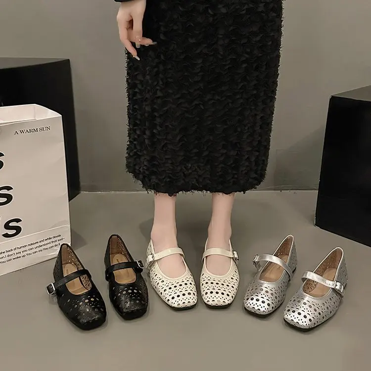Women Square Toe Shoes Summer Elegant Solid Colour Buckle Hollow Casual Non-slip Lightweight Slip on Loafers Sapato Feminino