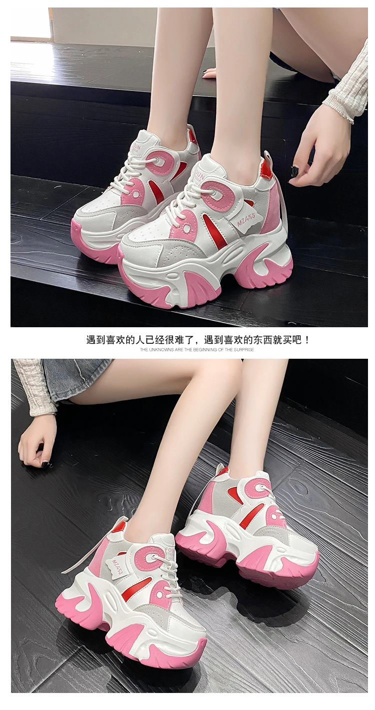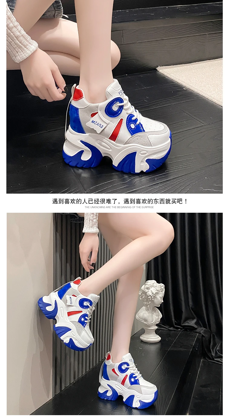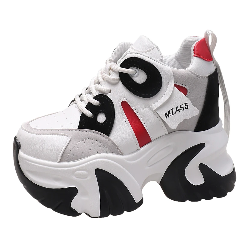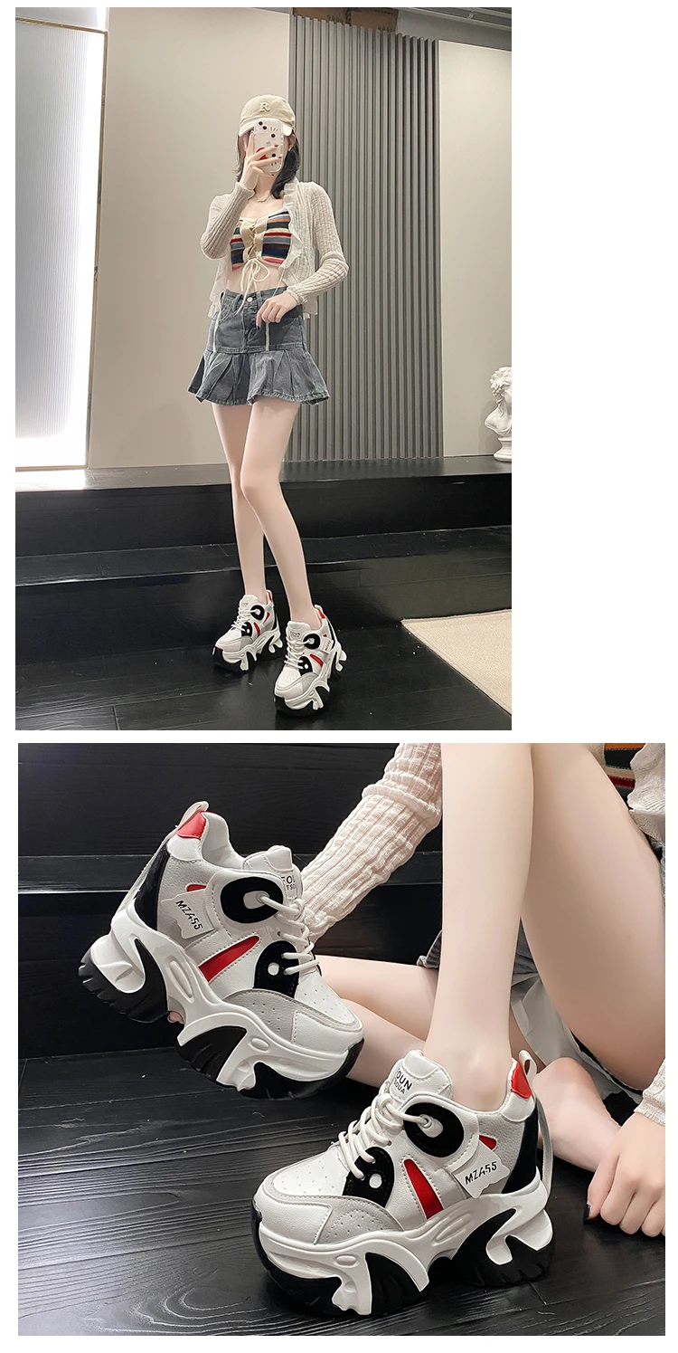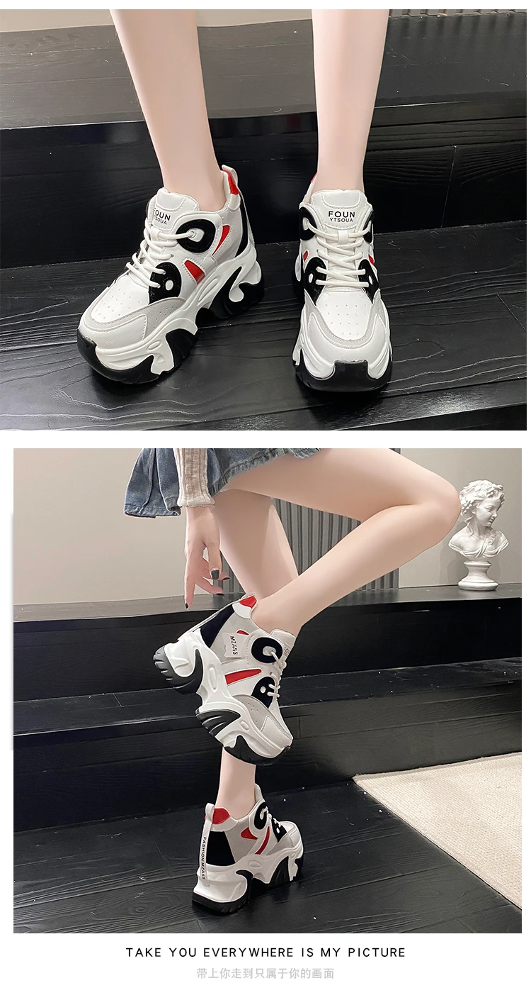 Women Walking Sneakers New Autumn Lace-up High Platform Chunky Shoes Breathable Leather Shoes 10.5CM Wedge Heels Casual Shoes