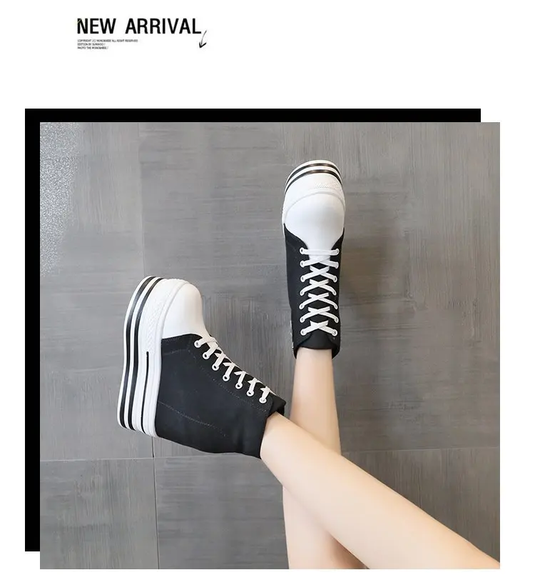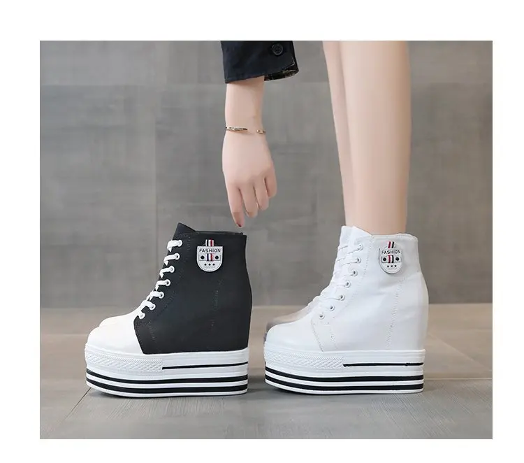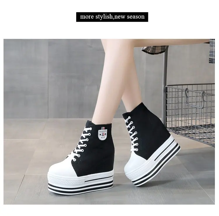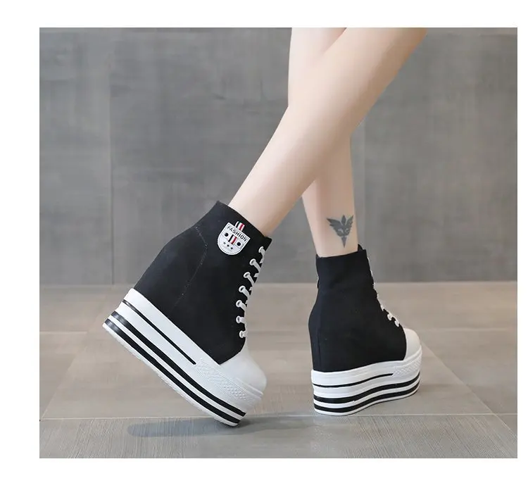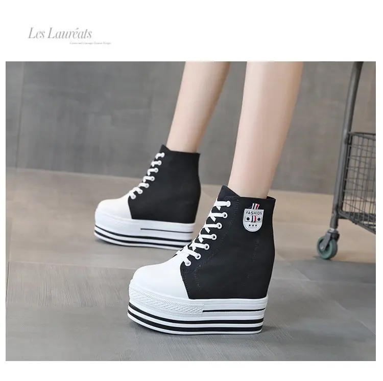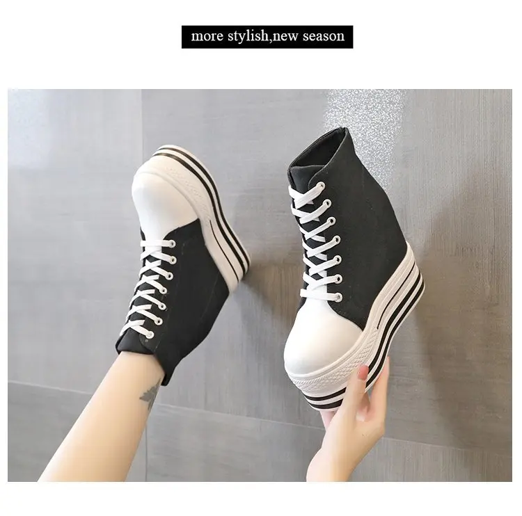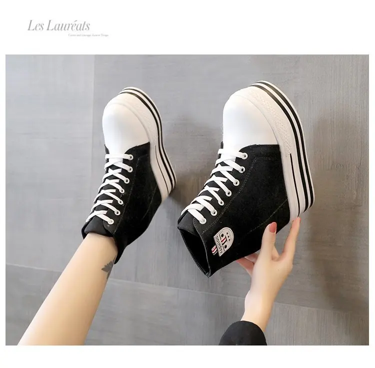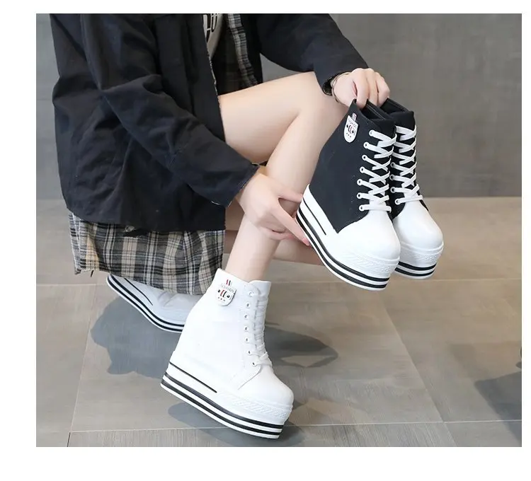 Women's High Canvas Sneakers Chunky Platform Shoes Black Lace-Up Thick Bottom Internal Increase Autumn Female Casual Shoes Hot